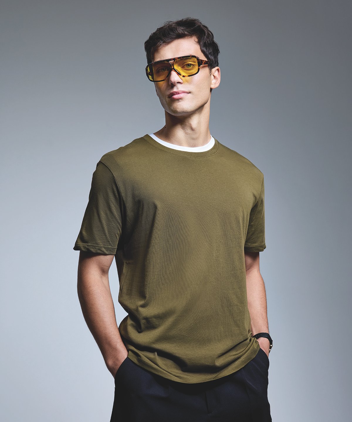 Solid colours are 100% organic cotton. Marl colours 60% cotton and 40% polyester. 32’s cotton count. Retail fashion fit. Soft-feel finish. Ribbed crew neck. Chain stitch detailing on shoulders and around back of neck. Twin-needle stitched on hem and cuffs. Self-coloured neck size label.