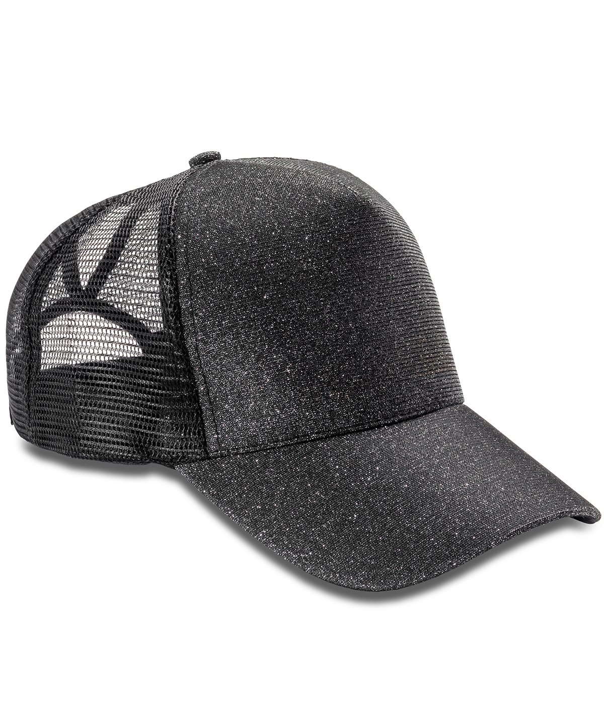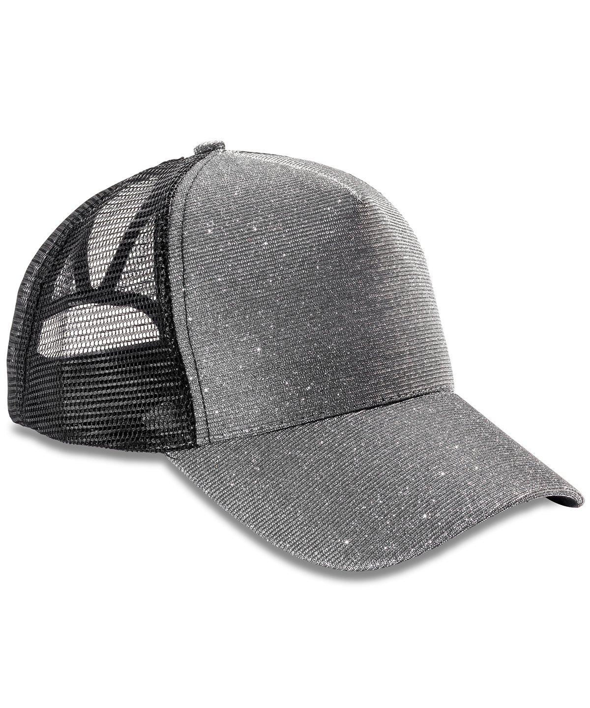 5-panel cap (4 mesh/1 fabric). Sparkle fabric stiffened front panel and peak. Mesh back with ponytail hole. Tear-release adjuster. Semi-curved fabric peak made from recycled plastic. Tear-away label.