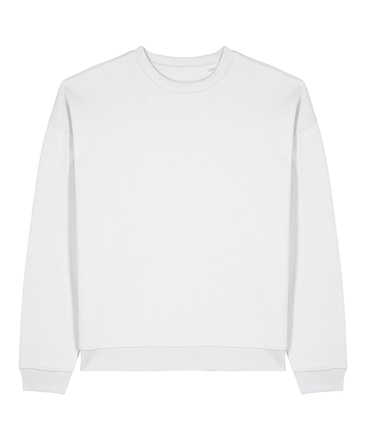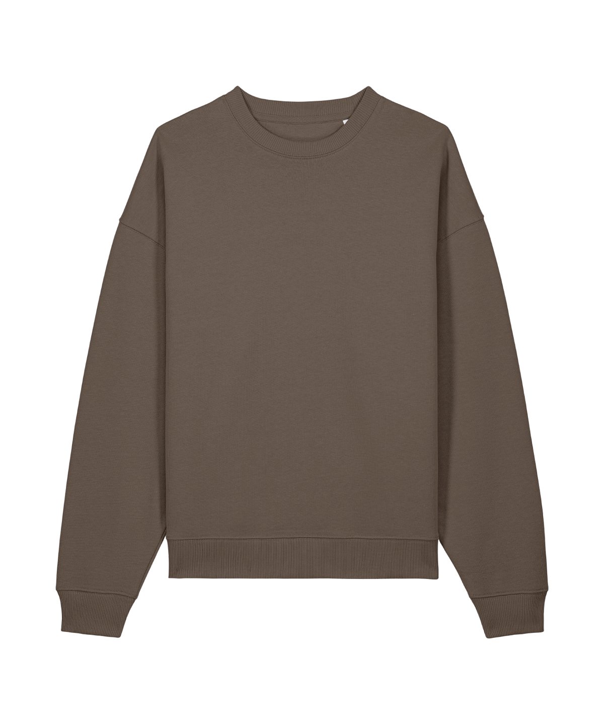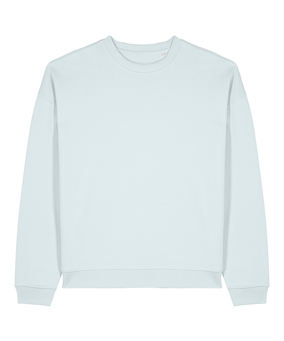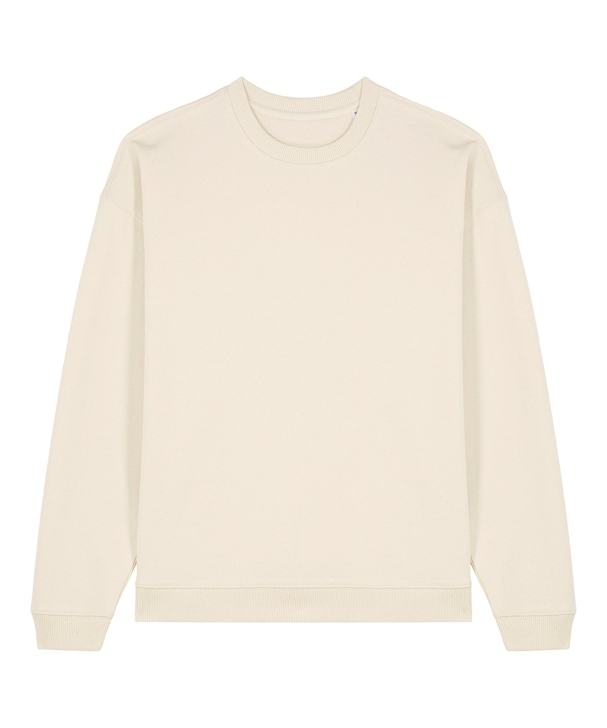 Set-in sleeves. 2×1 rib at collar, sleeve cuffs and bottom hem. Double-needle topstitches on all seams. Inside herringbone back neck tape. Self-fabric half moon at the back neck.