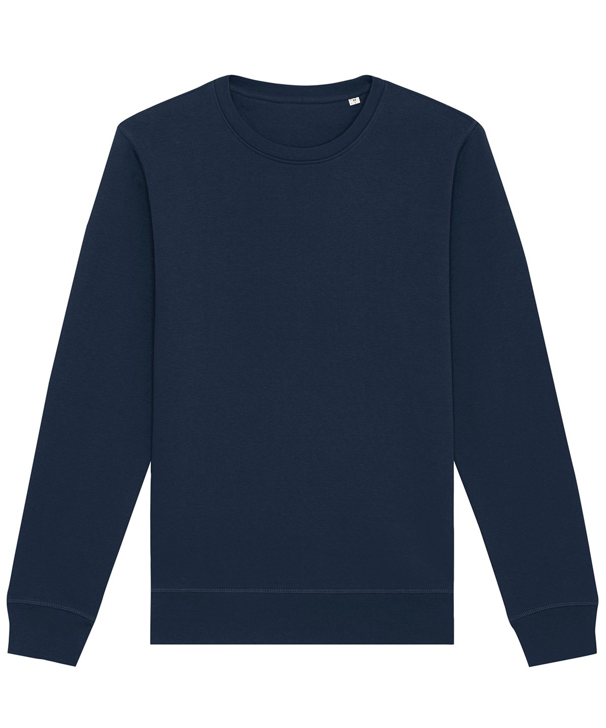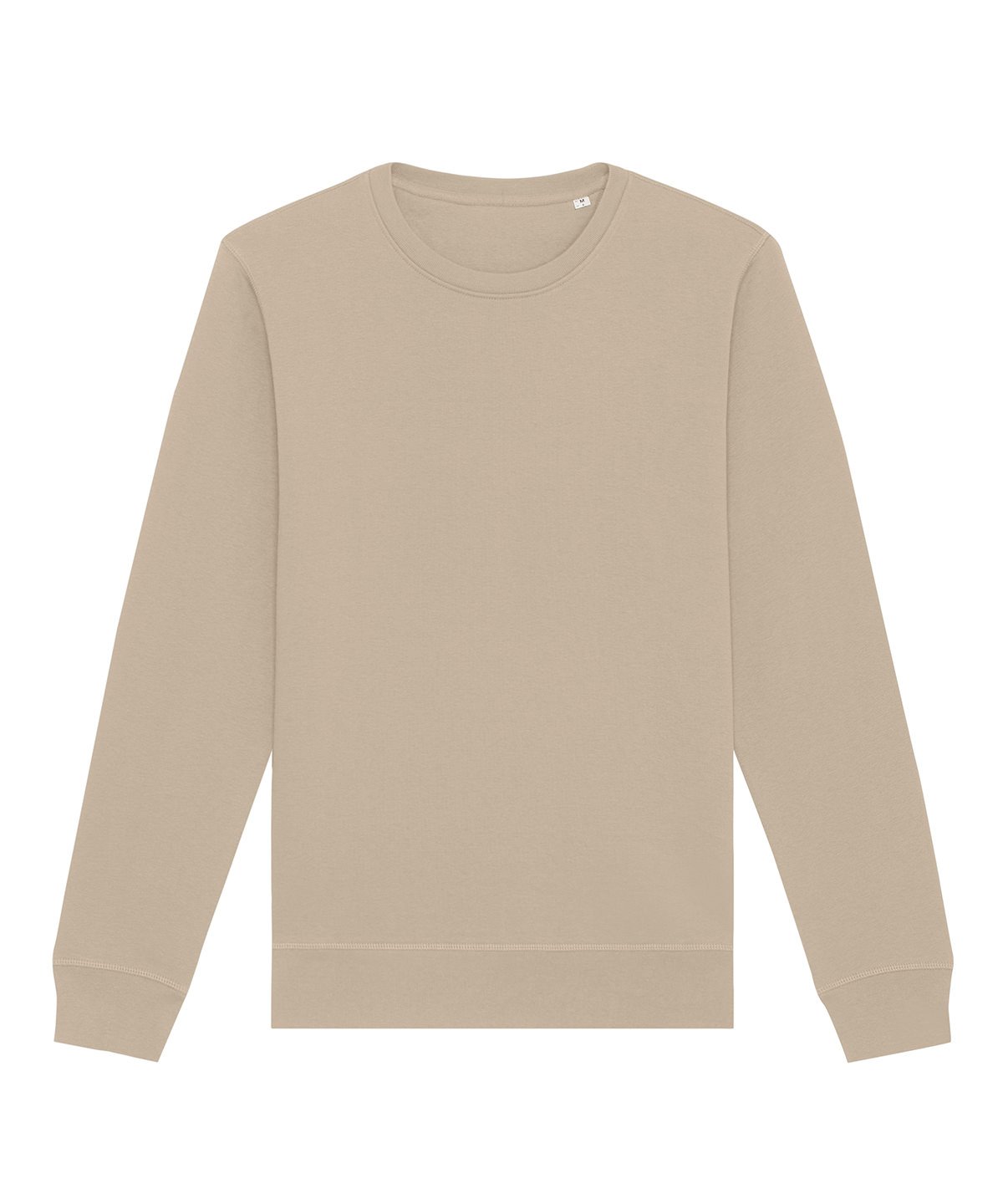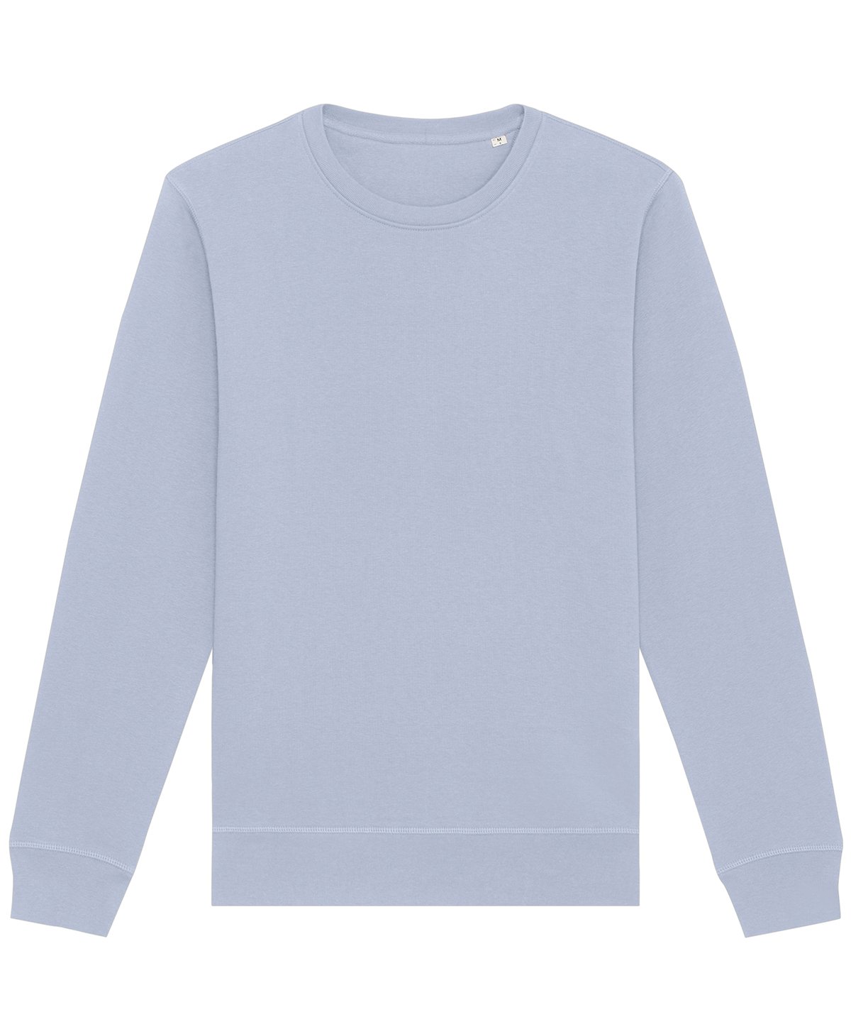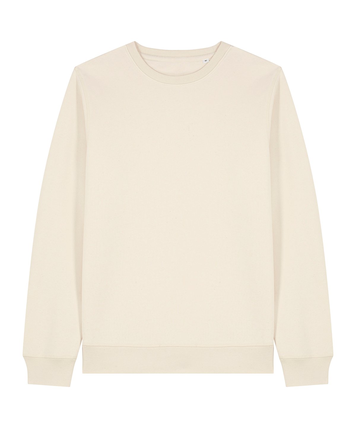 Set-in sleeve. 1×1 rib at neck collar, sleeve hem and bottom hem. Inside herringbone back neck tape. Flatlock topstitch on all seams. Self-fabric half moon at back neck.