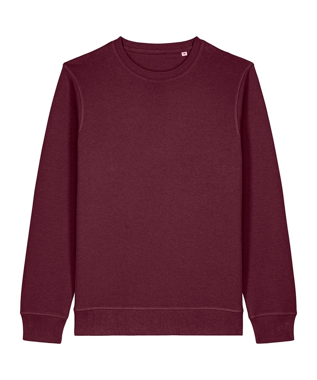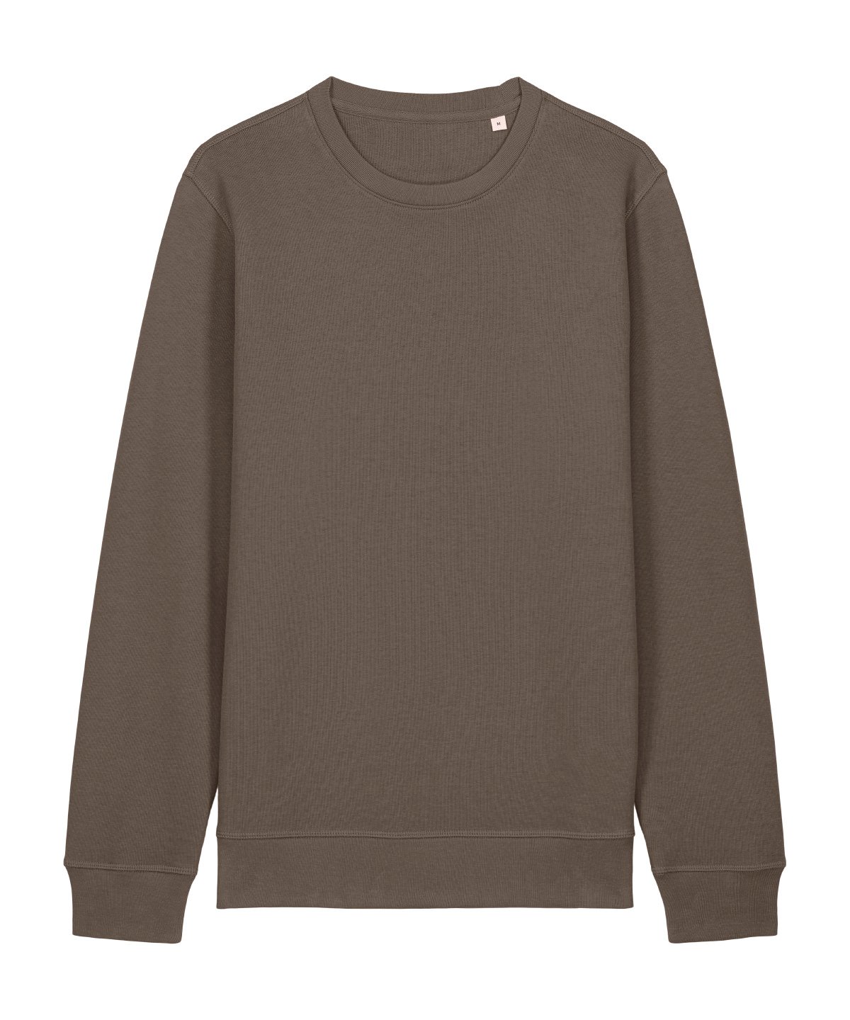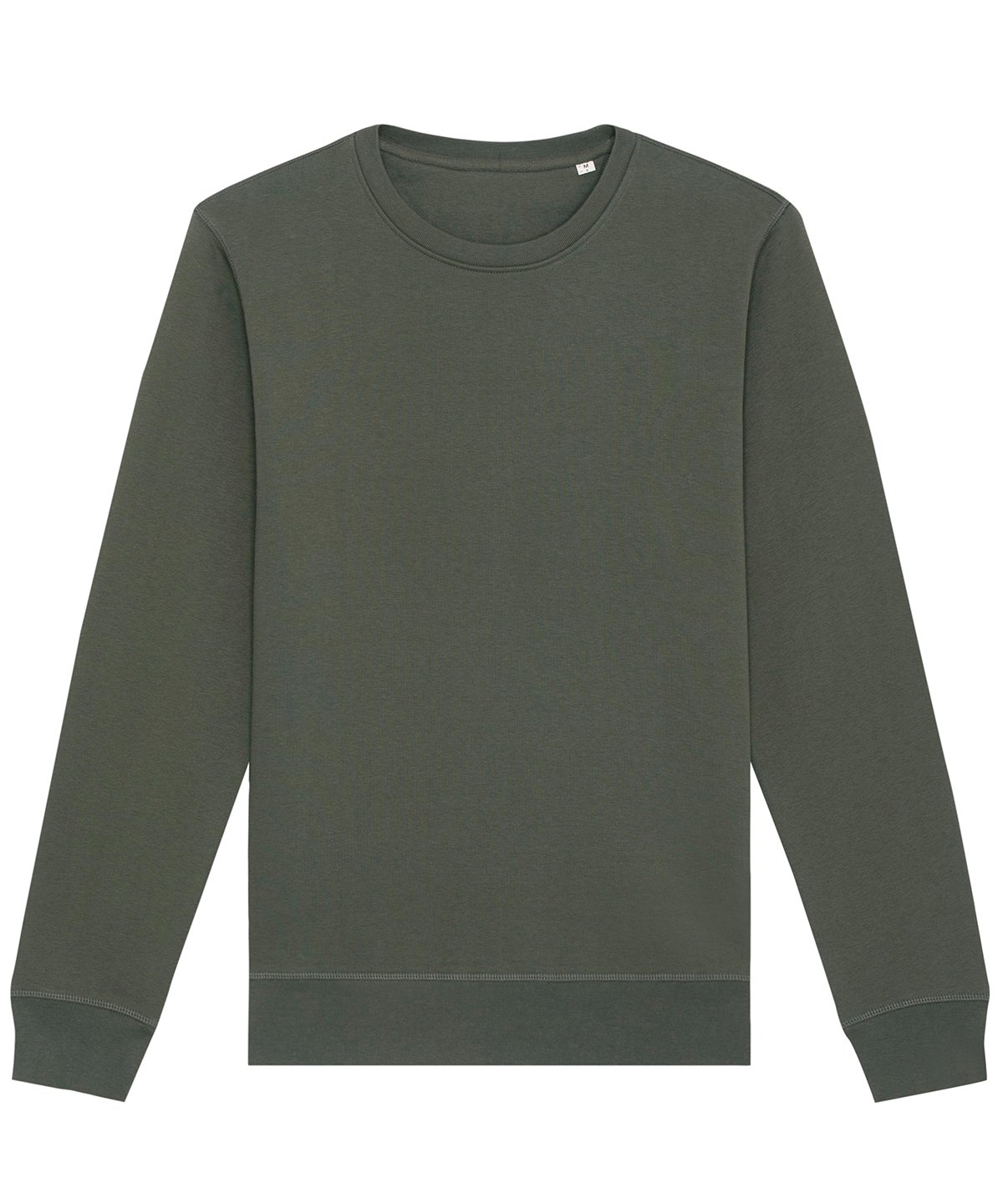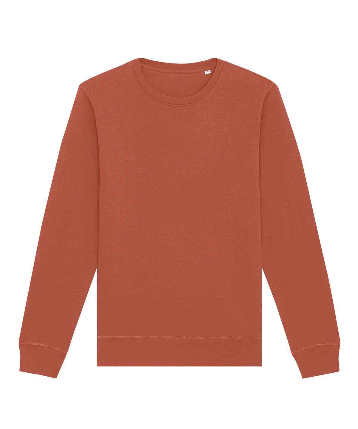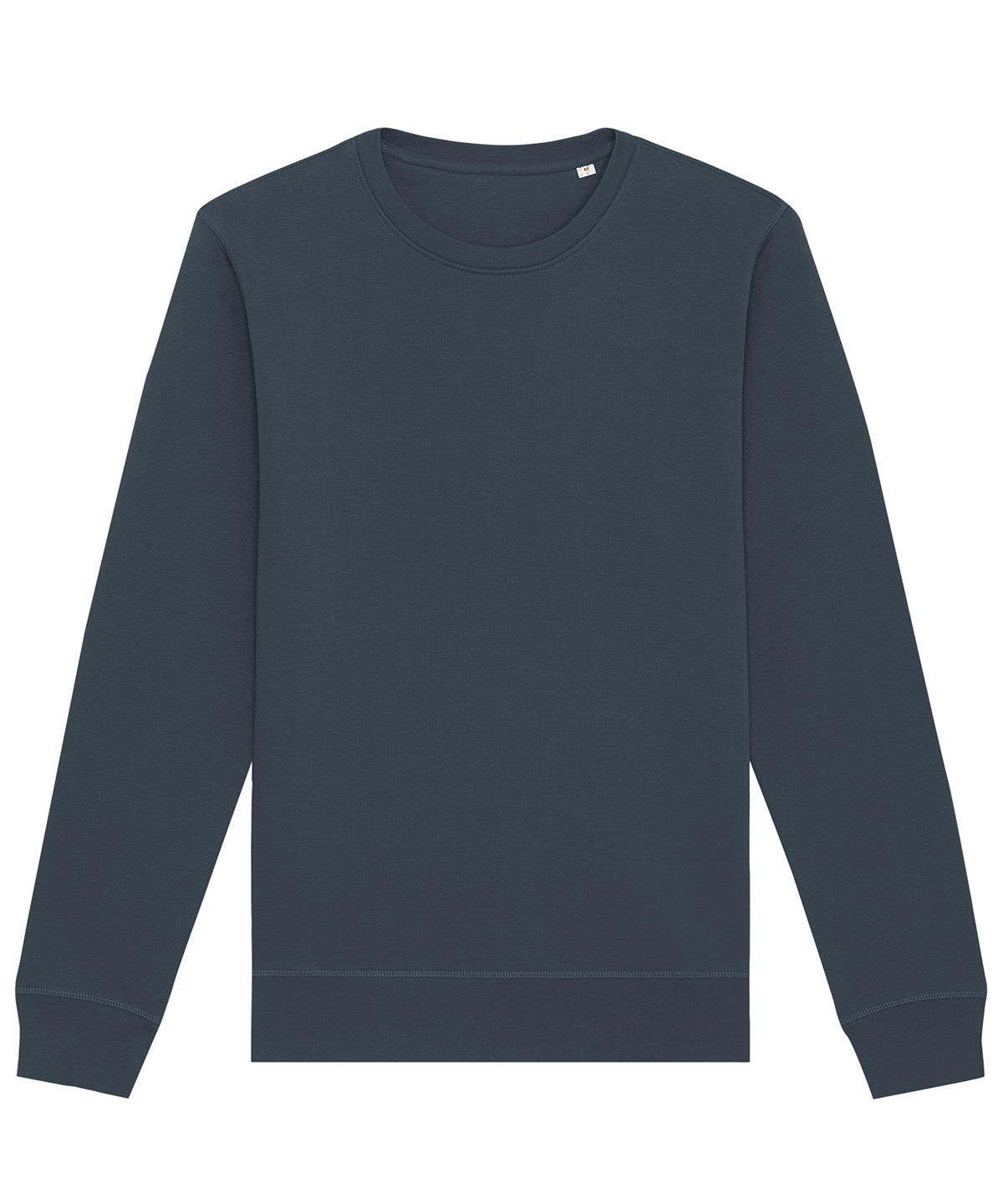 Set-in sleeve. 1×1 rib at neck collar, sleeve hem and bottom hem. Inside herringbone back neck tape. Flatlock topstitch on all seams. Self-fabric half moon at back neck.