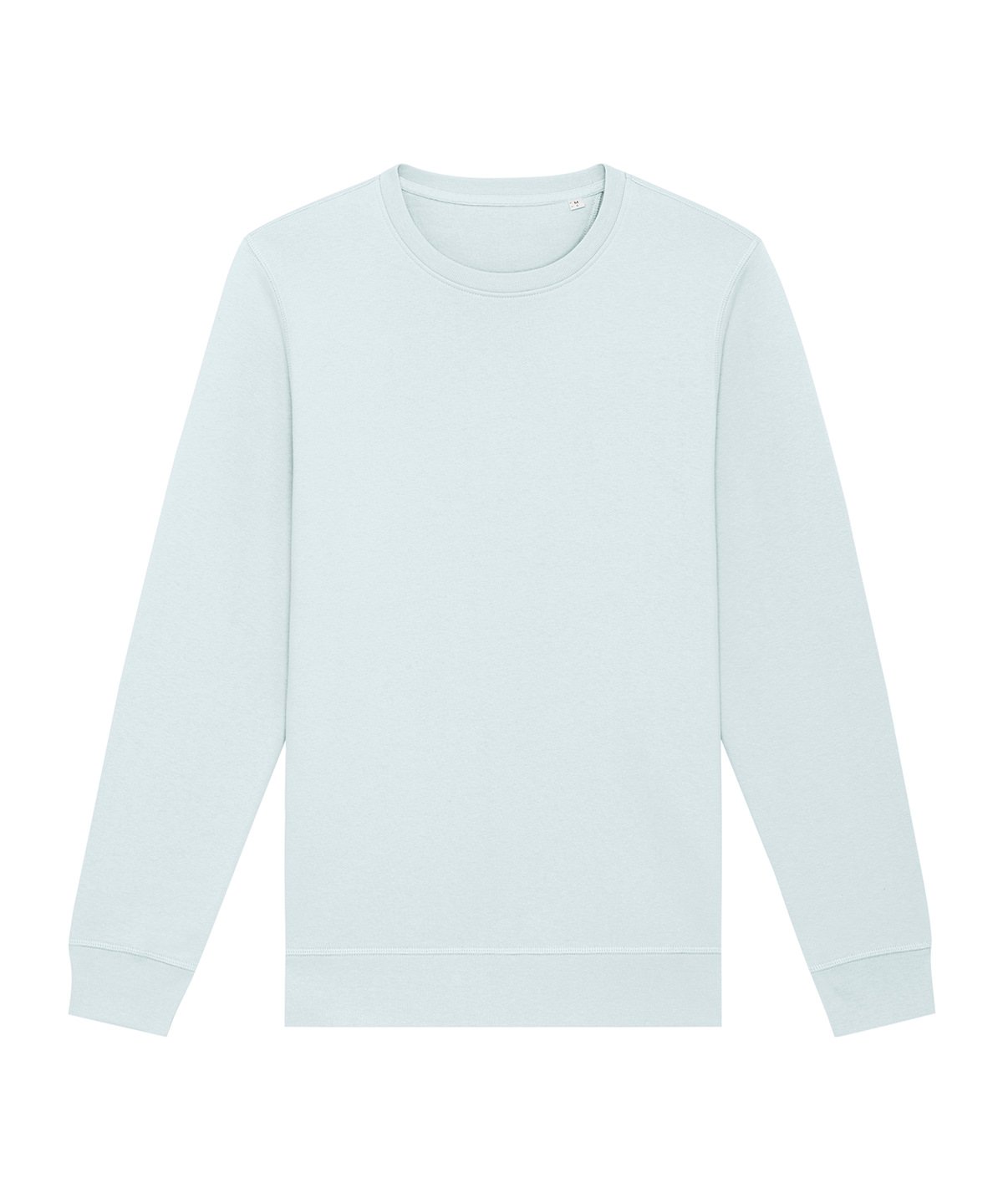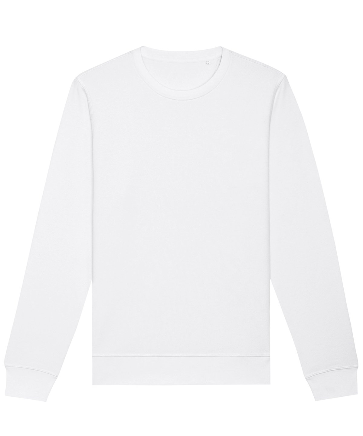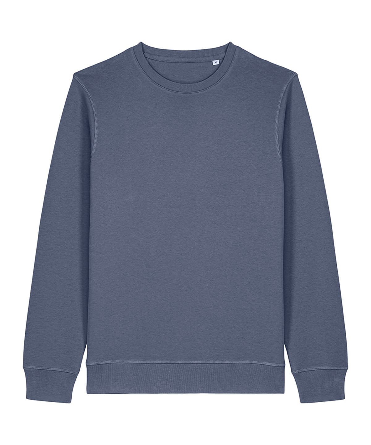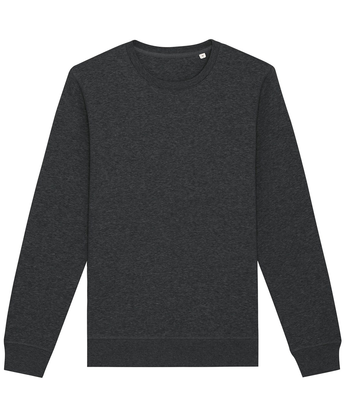Set-in sleeve. 1×1 rib at neck collar, sleeve hem and bottom hem. Inside herringbone back neck tape. Flatlock topstitch on all seams. Self-fabric half moon at back neck.