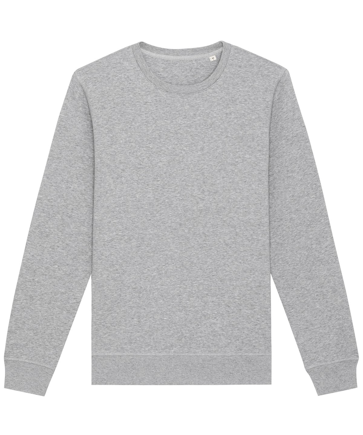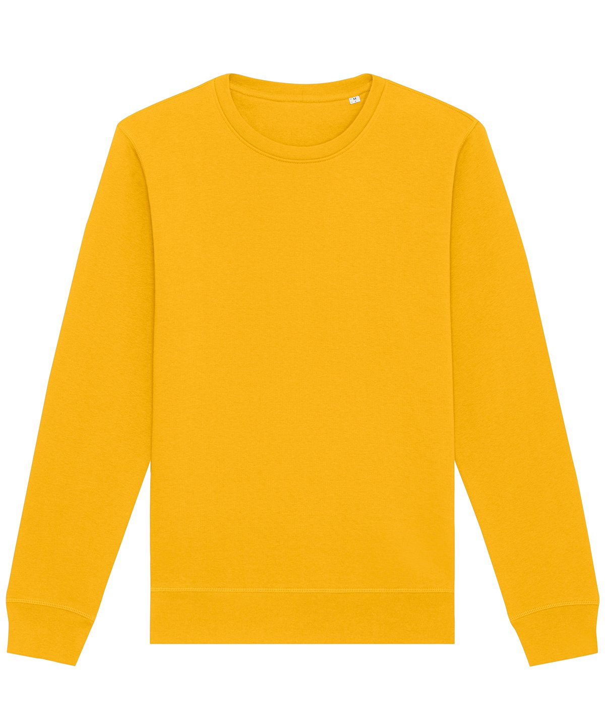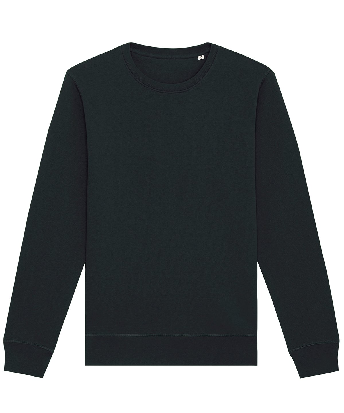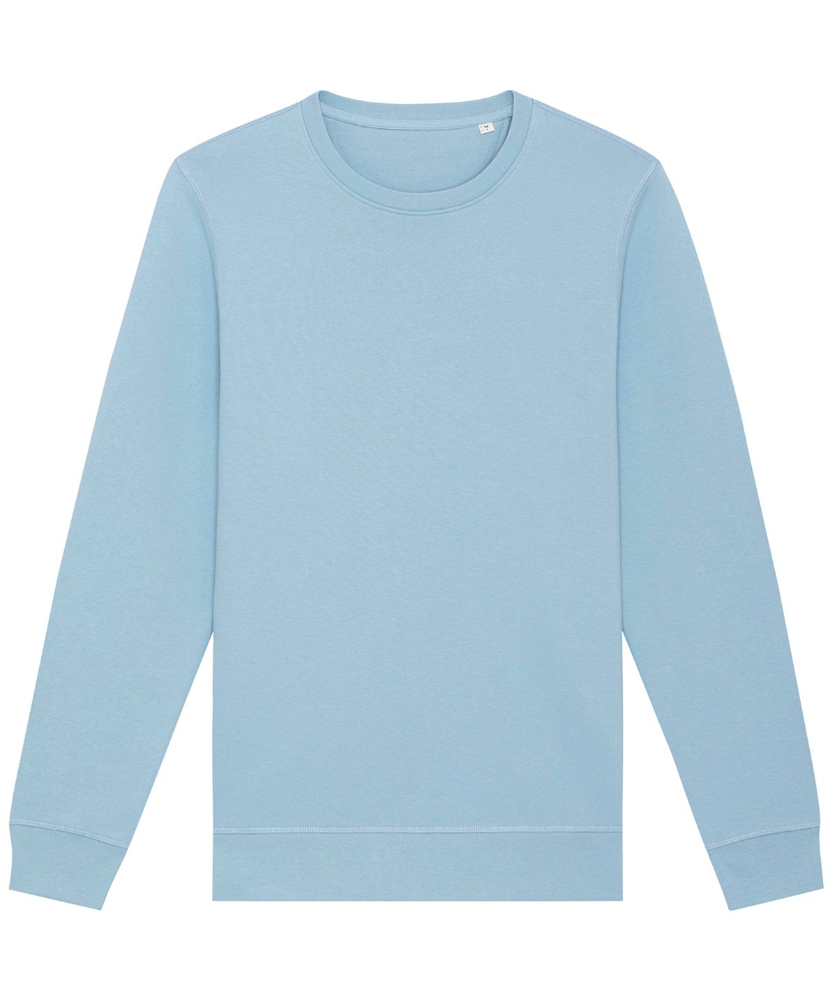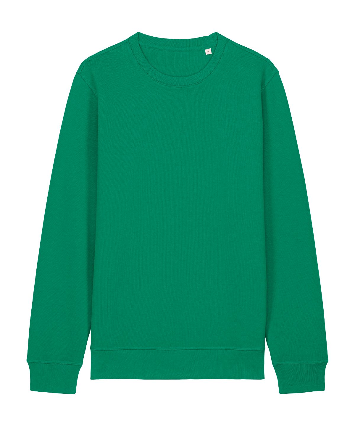 Set-in sleeve. 1×1 rib at neck collar, sleeve hem and bottom hem. Inside herringbone back neck tape. Flatlock topstitch on all seams. Self-fabric half moon at back neck.