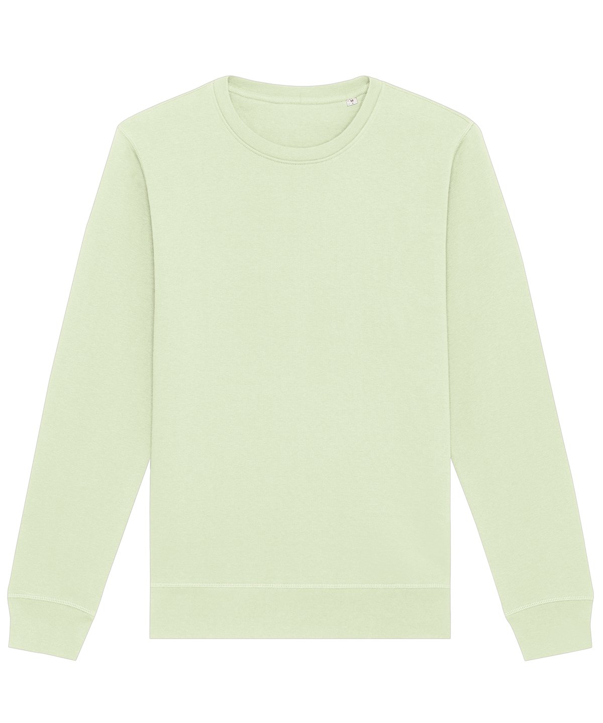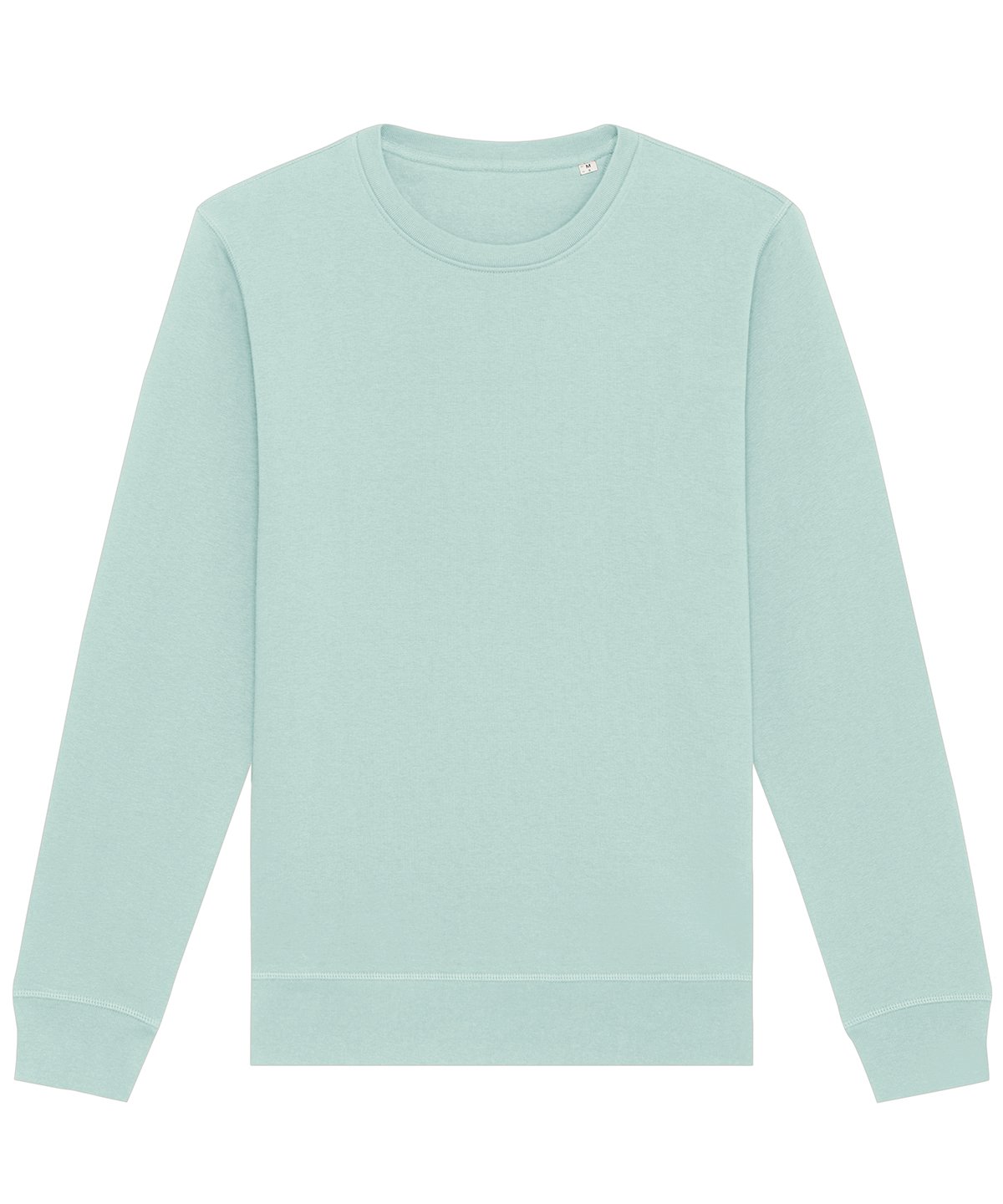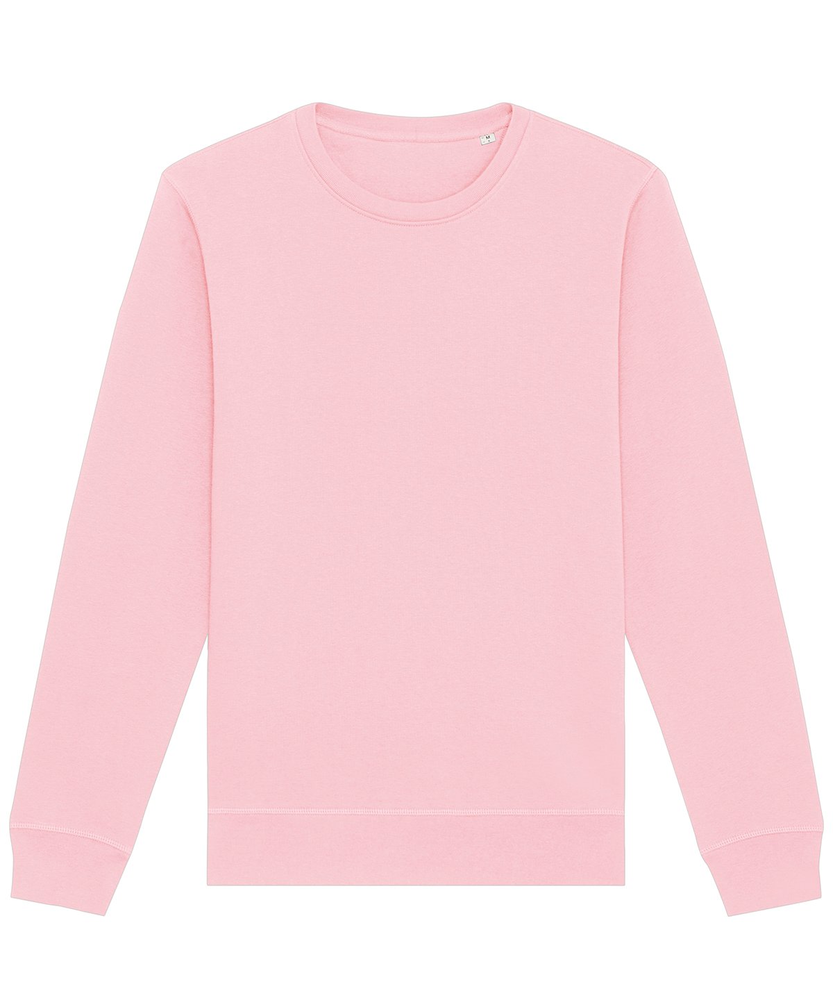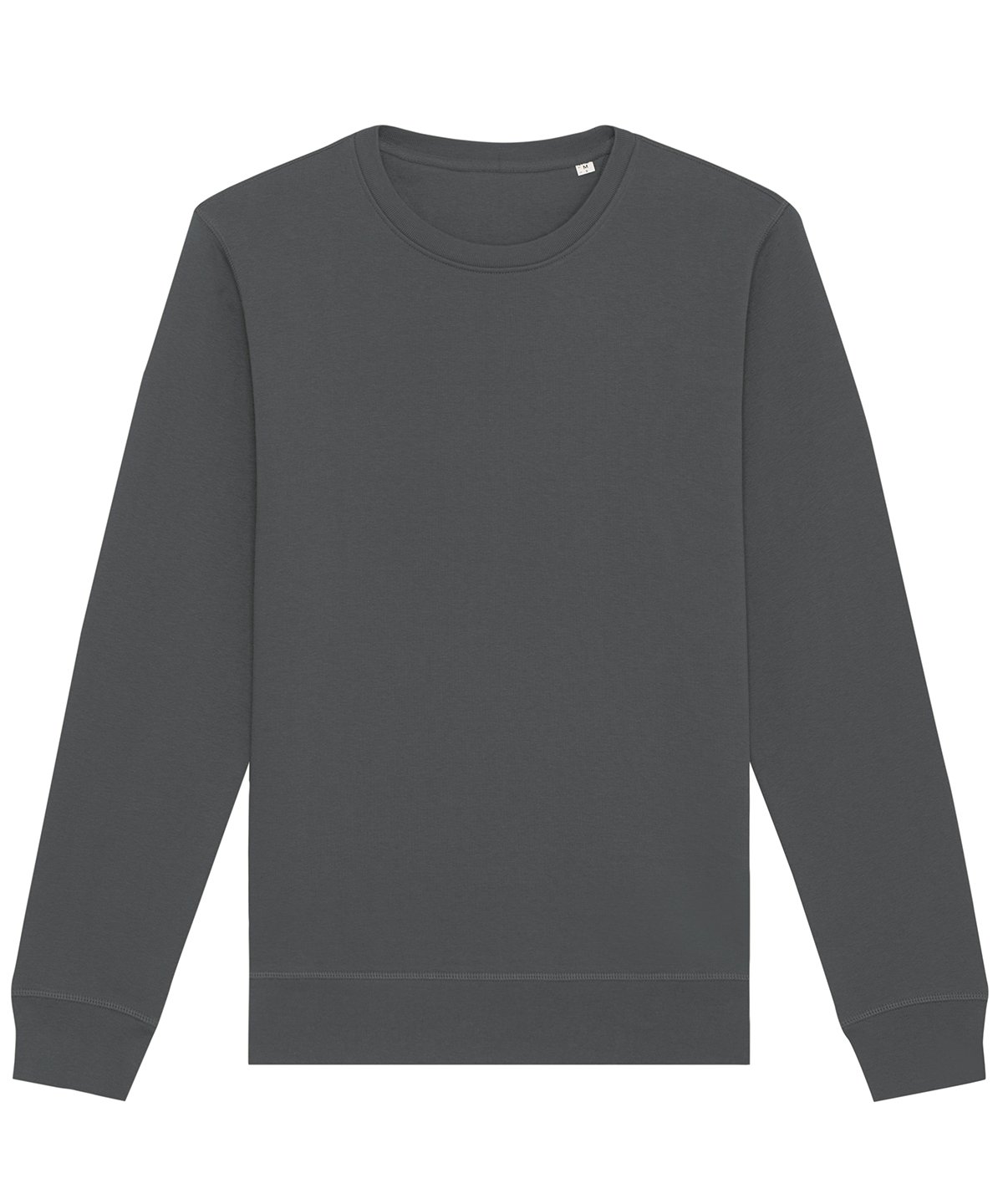 Set-in sleeve. 1×1 rib at neck collar, sleeve hem and bottom hem. Inside herringbone back neck tape. Flatlock topstitch on all seams. Self-fabric half moon at back neck.
