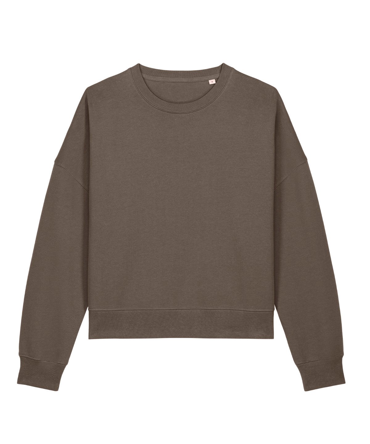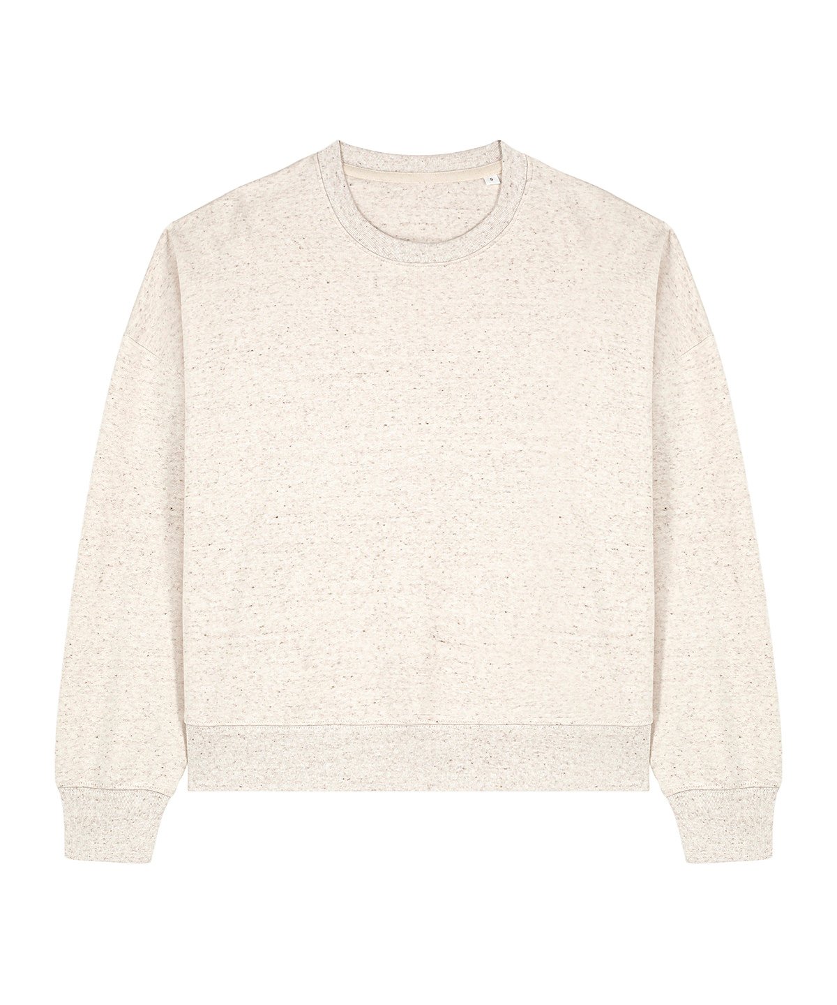 Set-in sleeves. Dropped shoulders. 1×1 ribs at collar, sleeve cuffs and bottom hem. Two-needle topstitches on all seams. Inside grosgrain back neck tape. Self-fabric half moon at back neck.