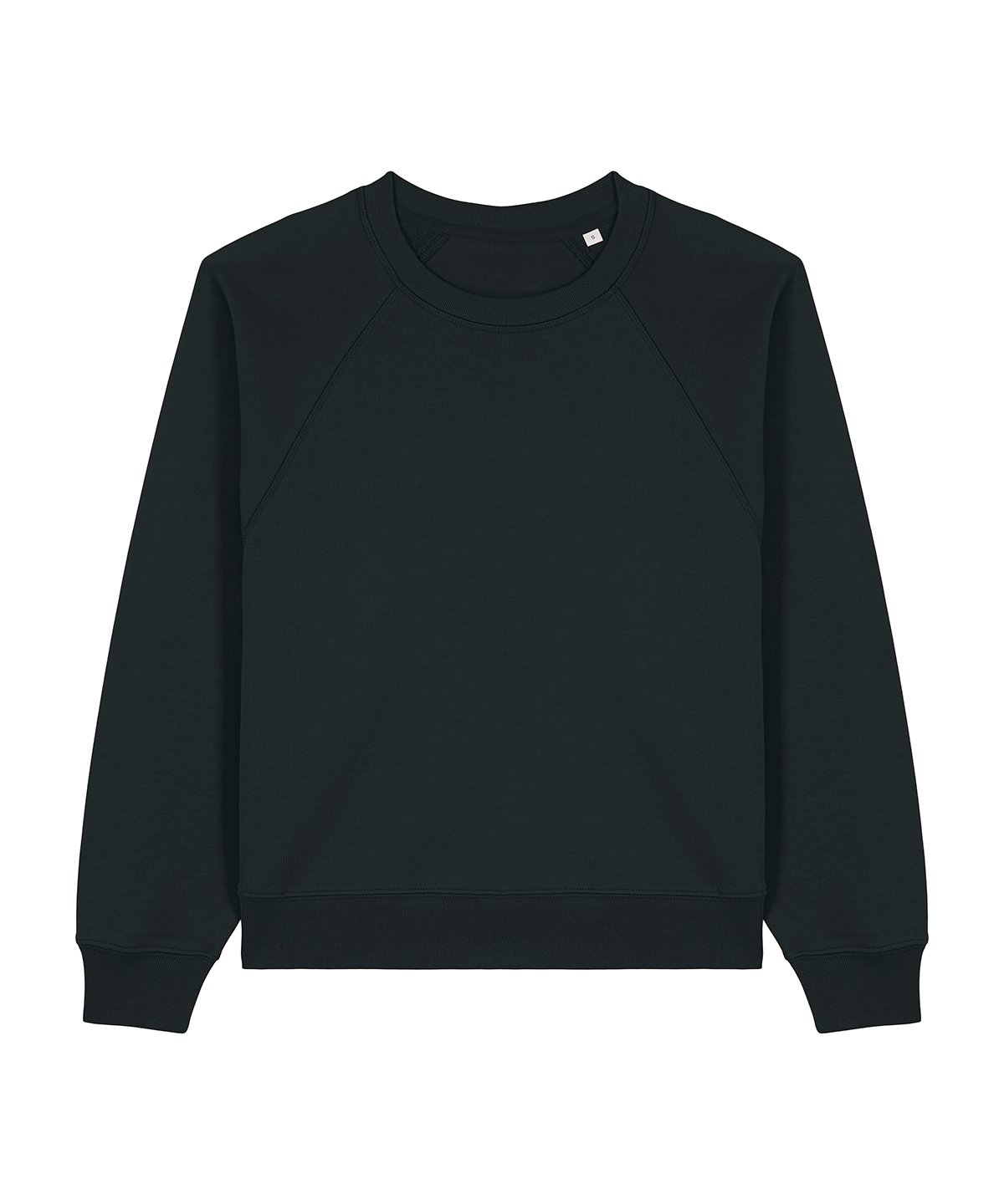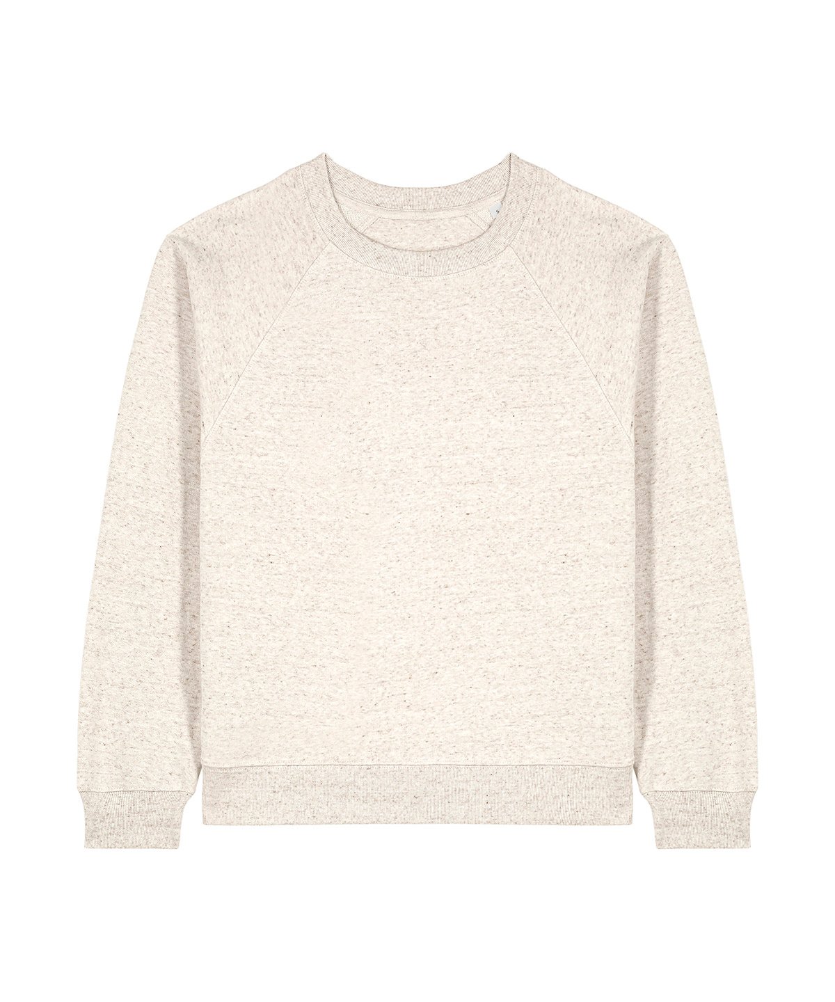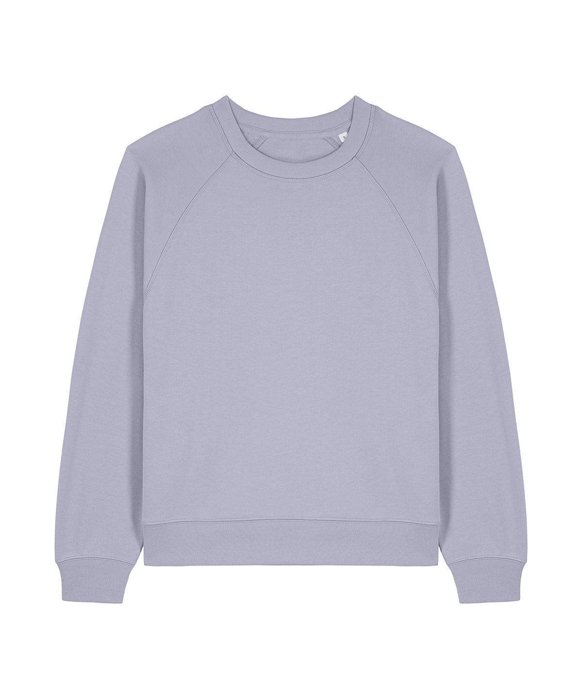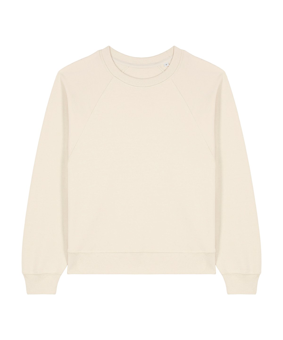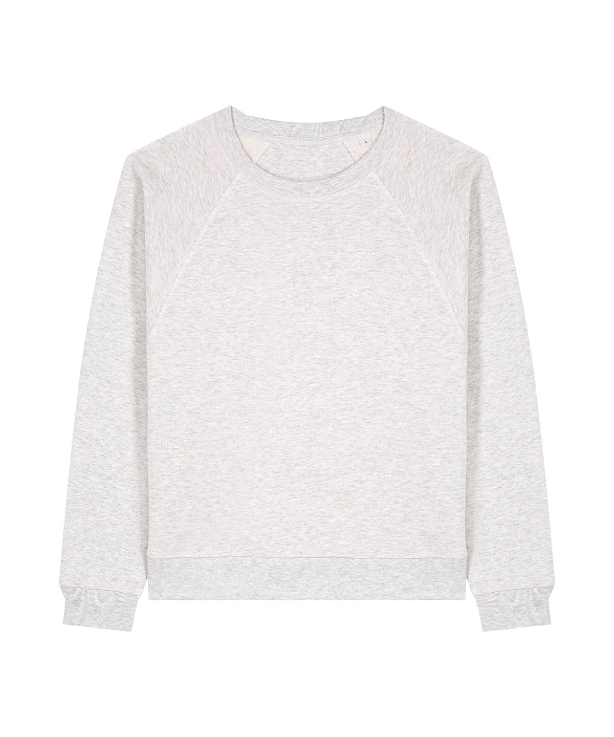 Raglan sleeves. 2×1 ribs at collar, sleeve cuffs and bottom hem. Three-needle flatlock stitches at neck, sleeves, side seams and half moon. Two-needle stitches at the bottom hem and sleeve cuffs. Inside grosgrain back neck tape. Self-fabric half moon at back neck.