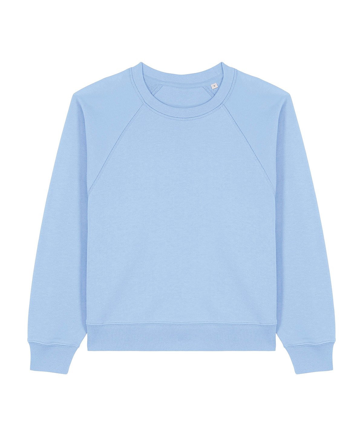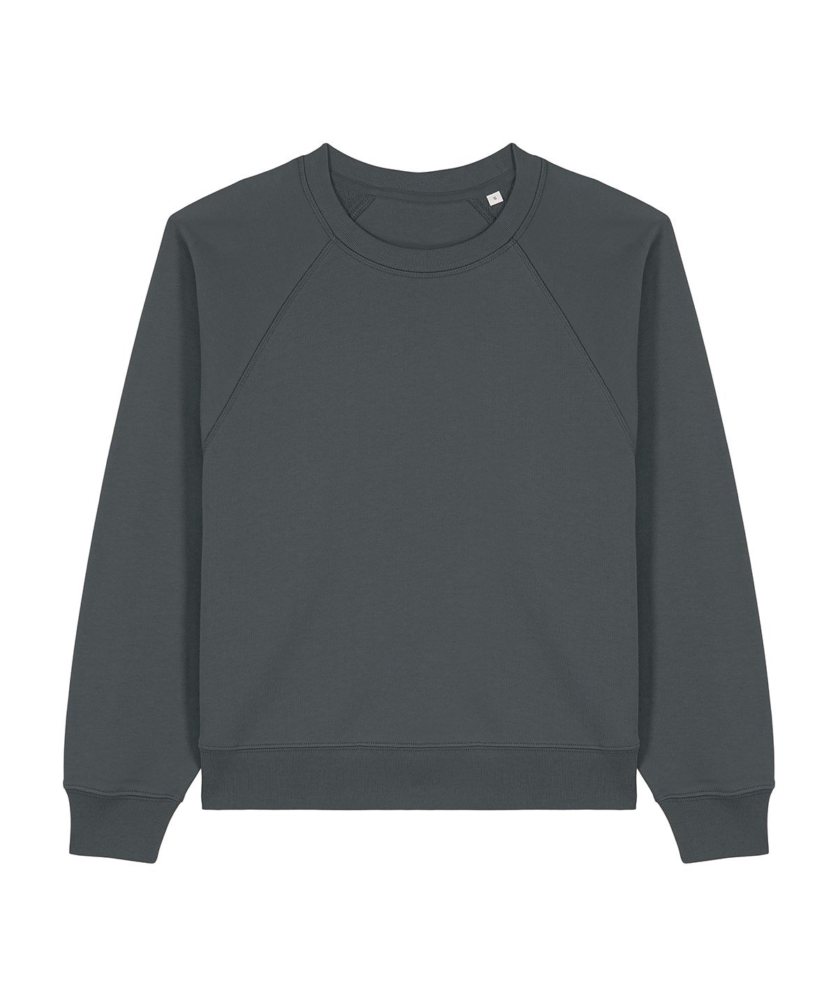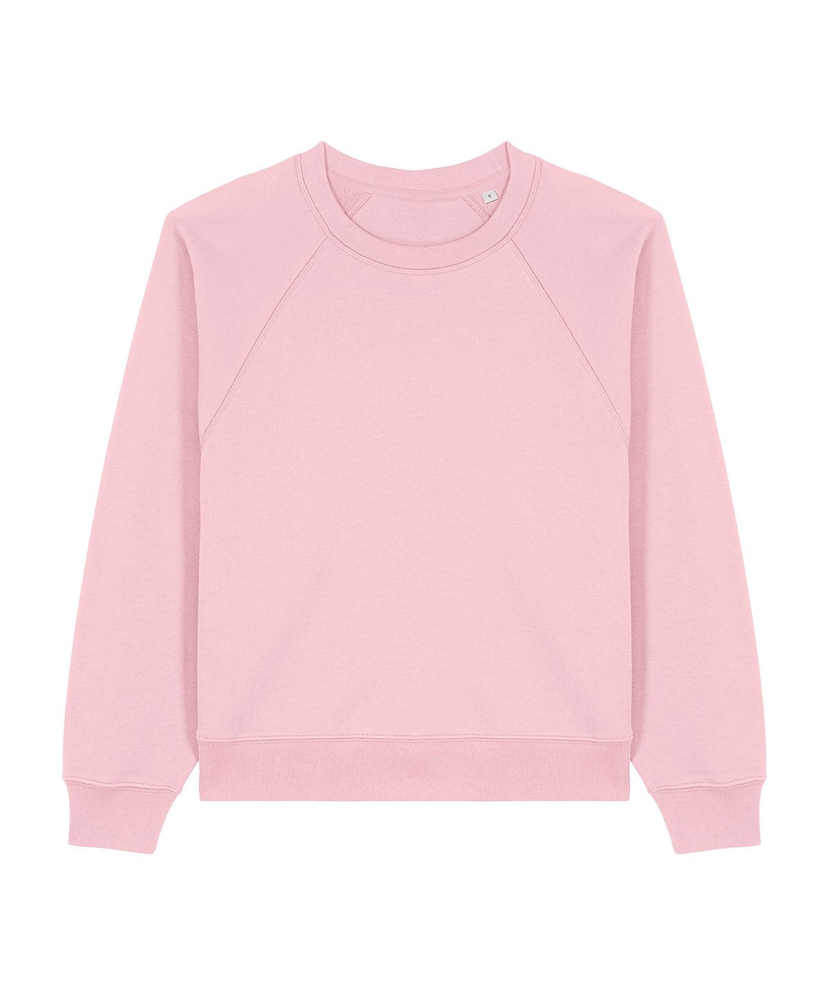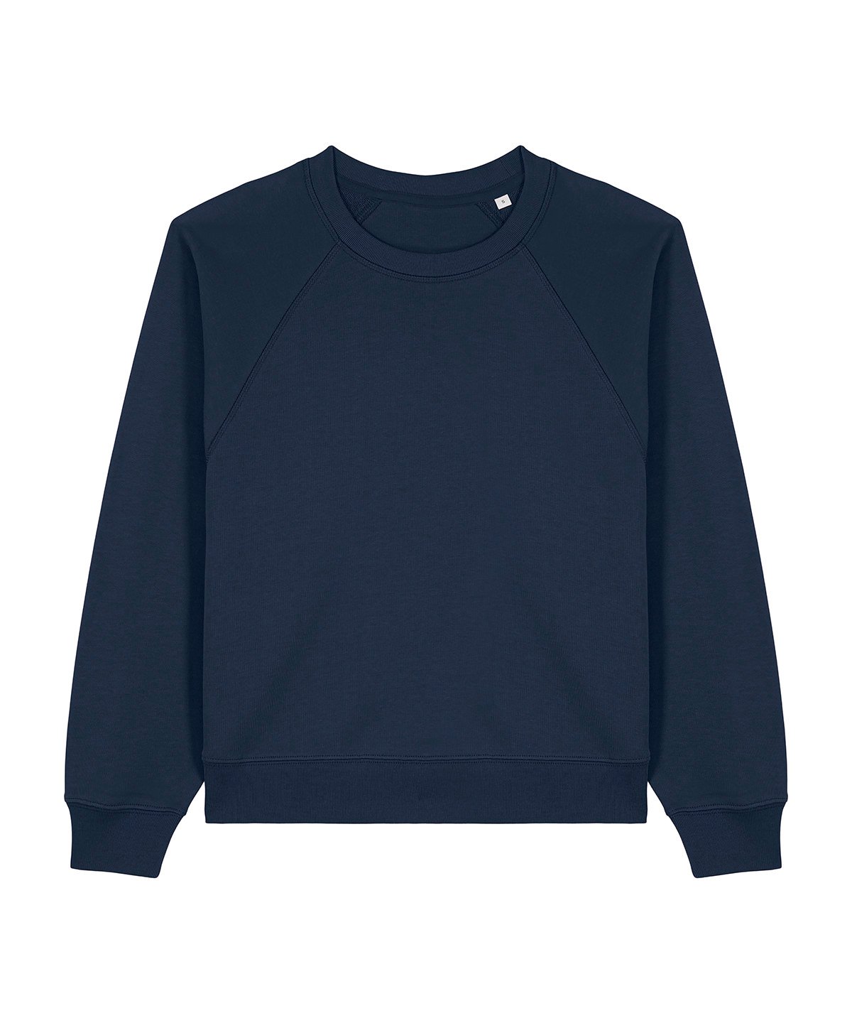 Raglan sleeves. 2×1 ribs at collar, sleeve cuffs and bottom hem. Three-needle flatlock stitches at neck, sleeves, side seams and half moon. Two-needle stitches at the bottom hem and sleeve cuffs. Inside grosgrain back neck tape. Self-fabric half moon at back neck.