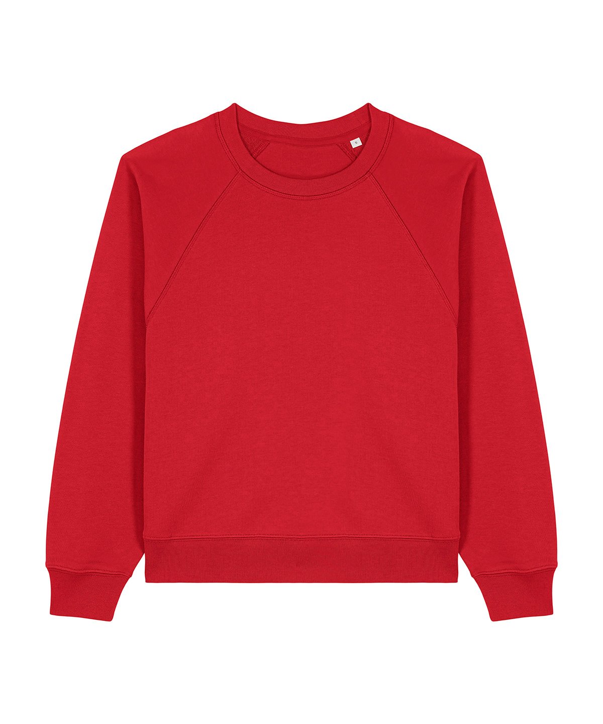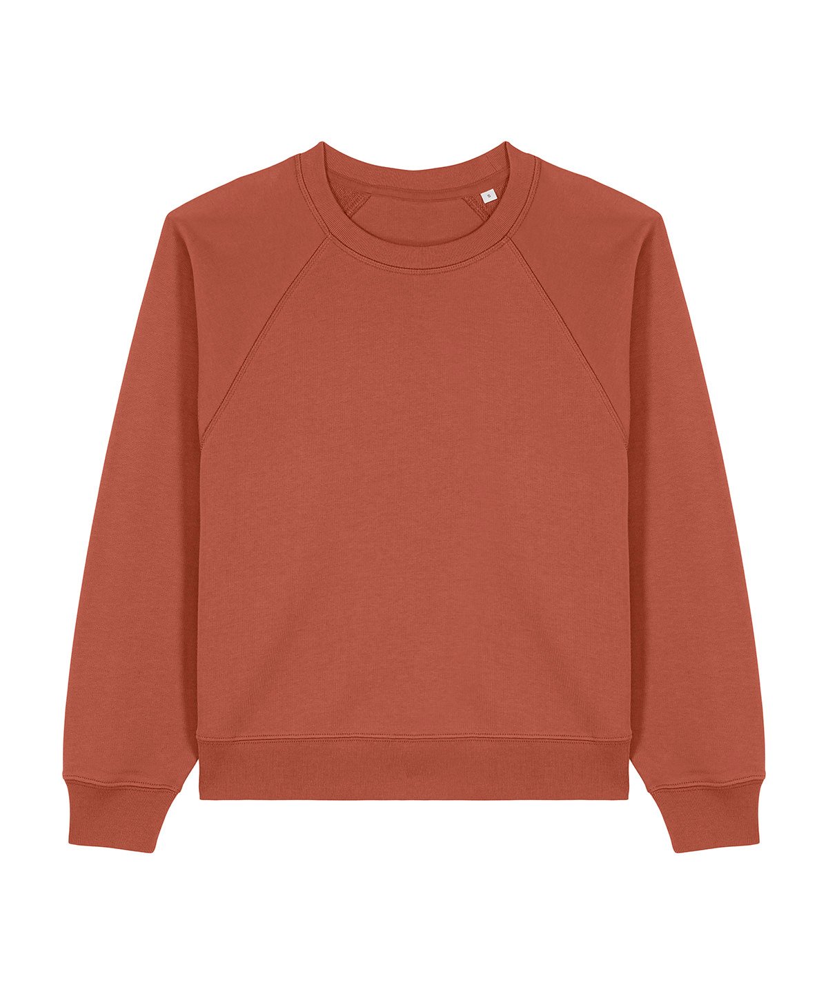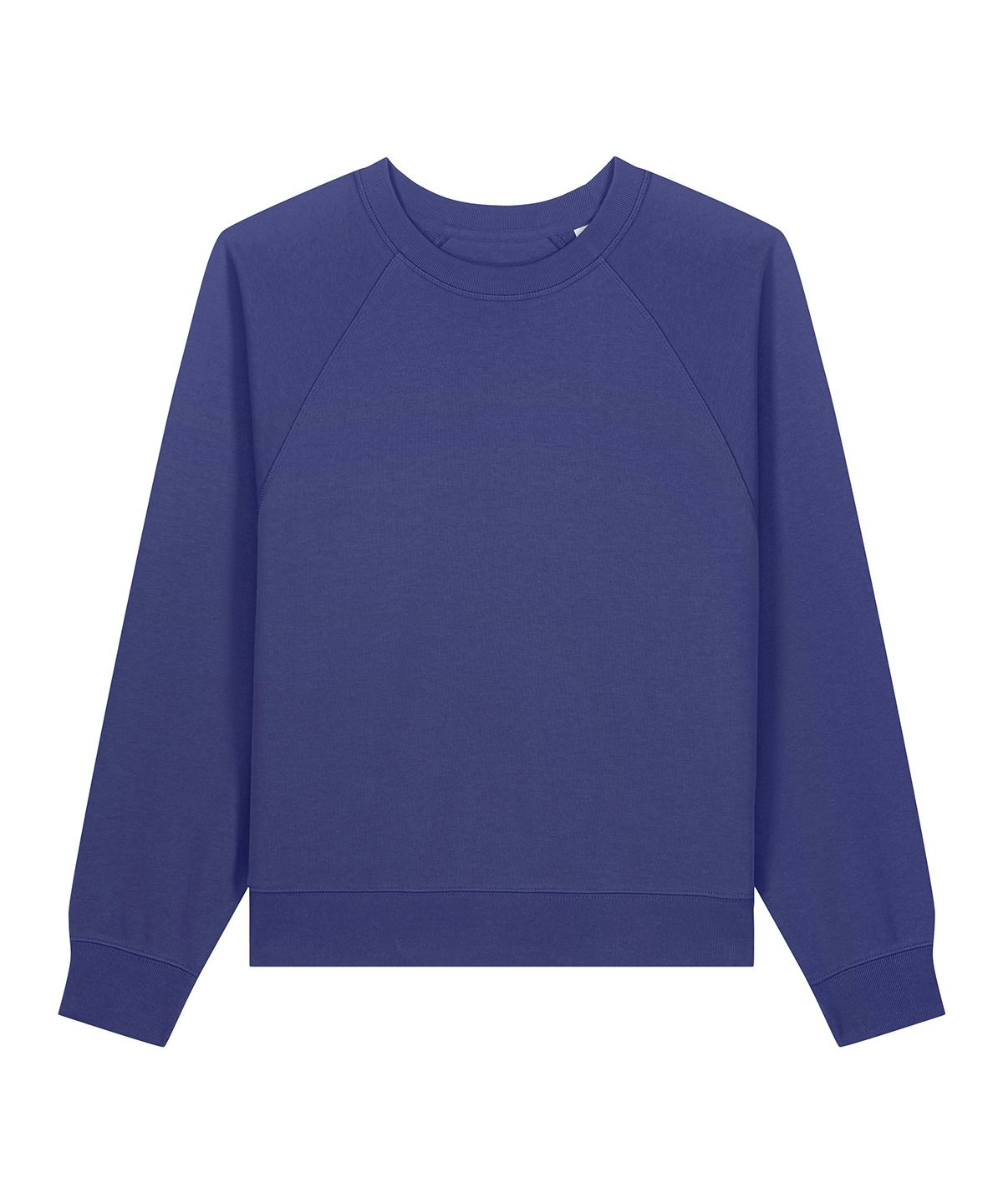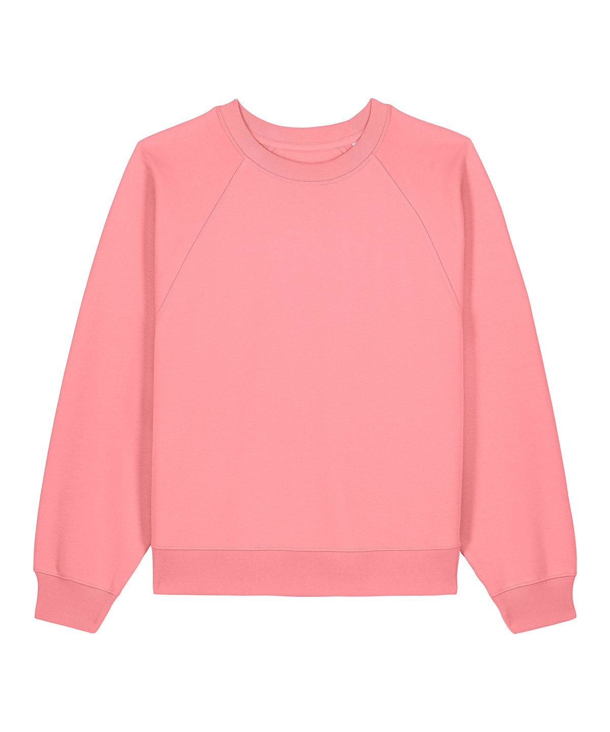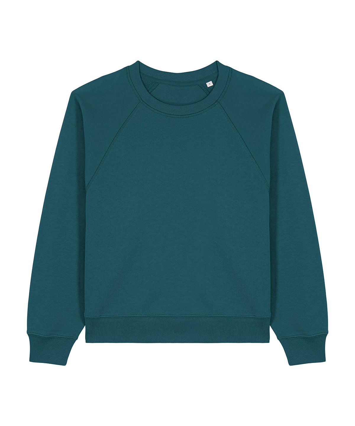 Raglan sleeves. 2×1 ribs at collar, sleeve cuffs and bottom hem. Three-needle flatlock stitches at neck, sleeves, side seams and half moon. Two-needle stitches at the bottom hem and sleeve cuffs. Inside grosgrain back neck tape. Self-fabric half moon at back neck.