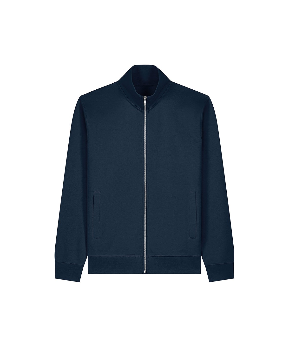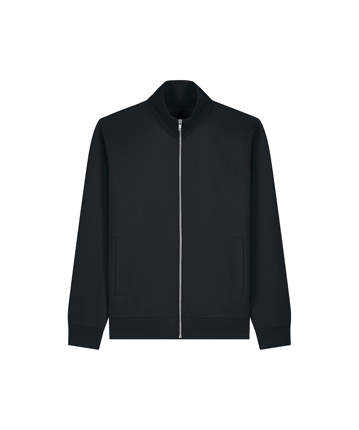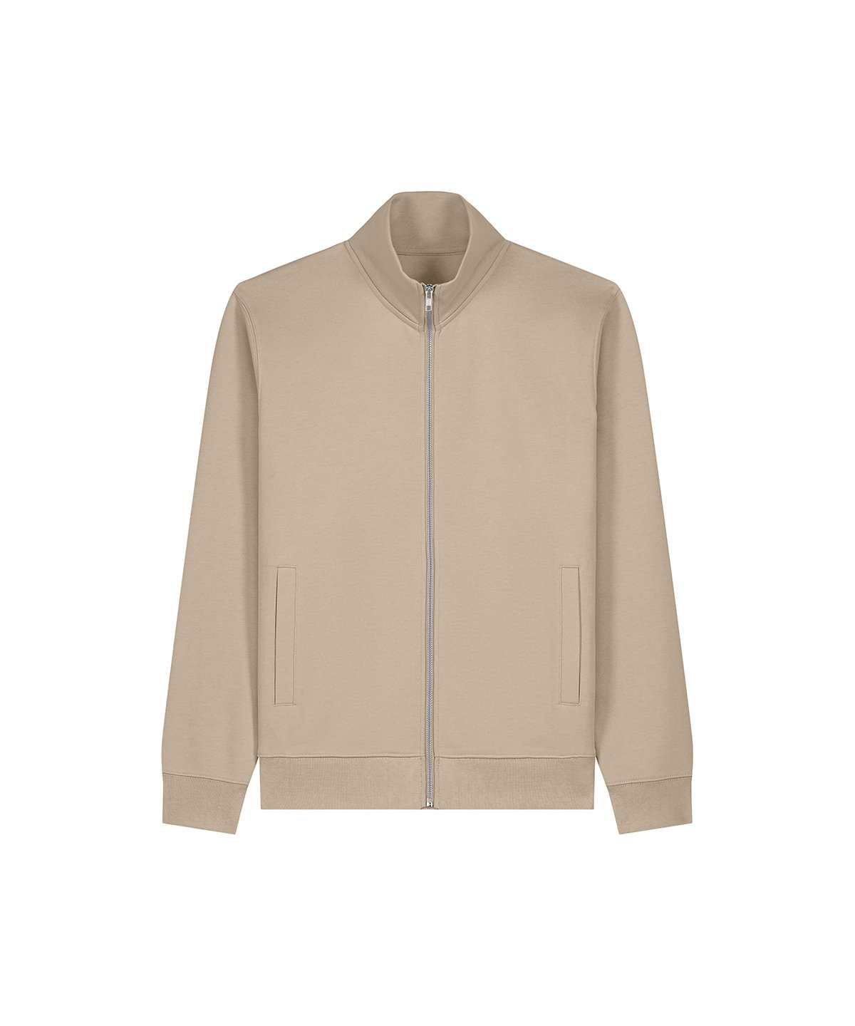 Unisex high-neck zip-through sweatshirt. Set-in sleeves. Self-fabric high-neck collar. Inside herringbone back neck tape. Self-fabric half-moon at the back neck. Metal zip at centre front. Welt pockets. 1×1 rib at sleeve cuffs and hem. Contains certified organic cotton and recycled polyester.