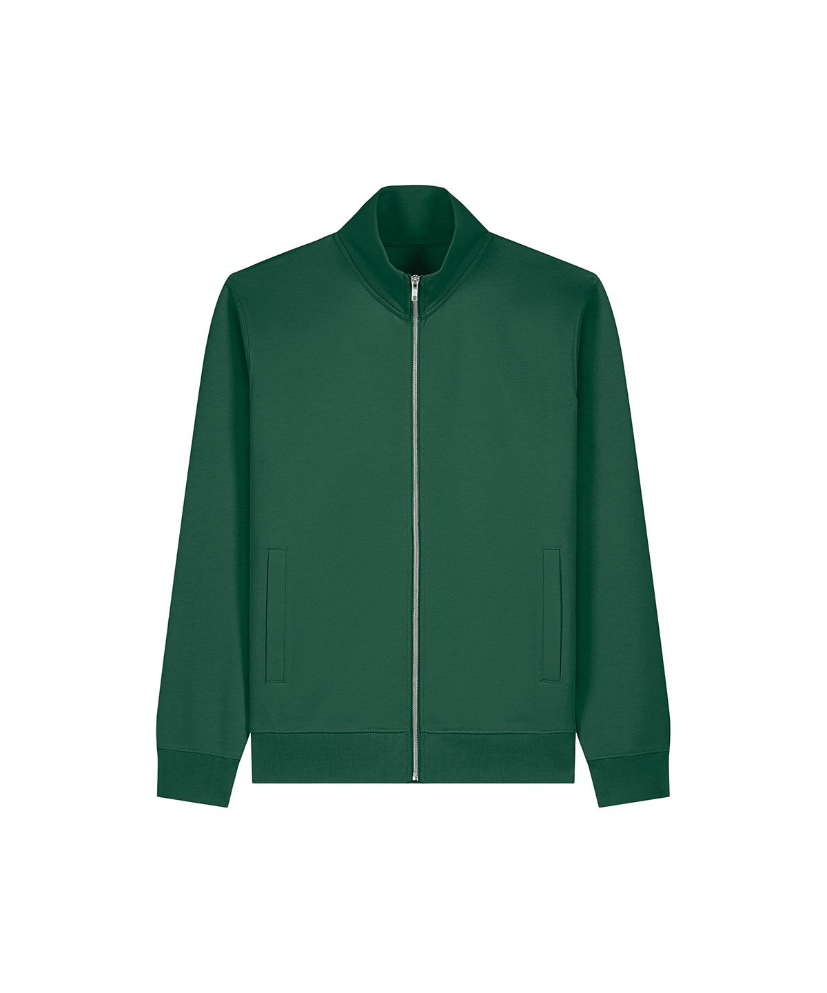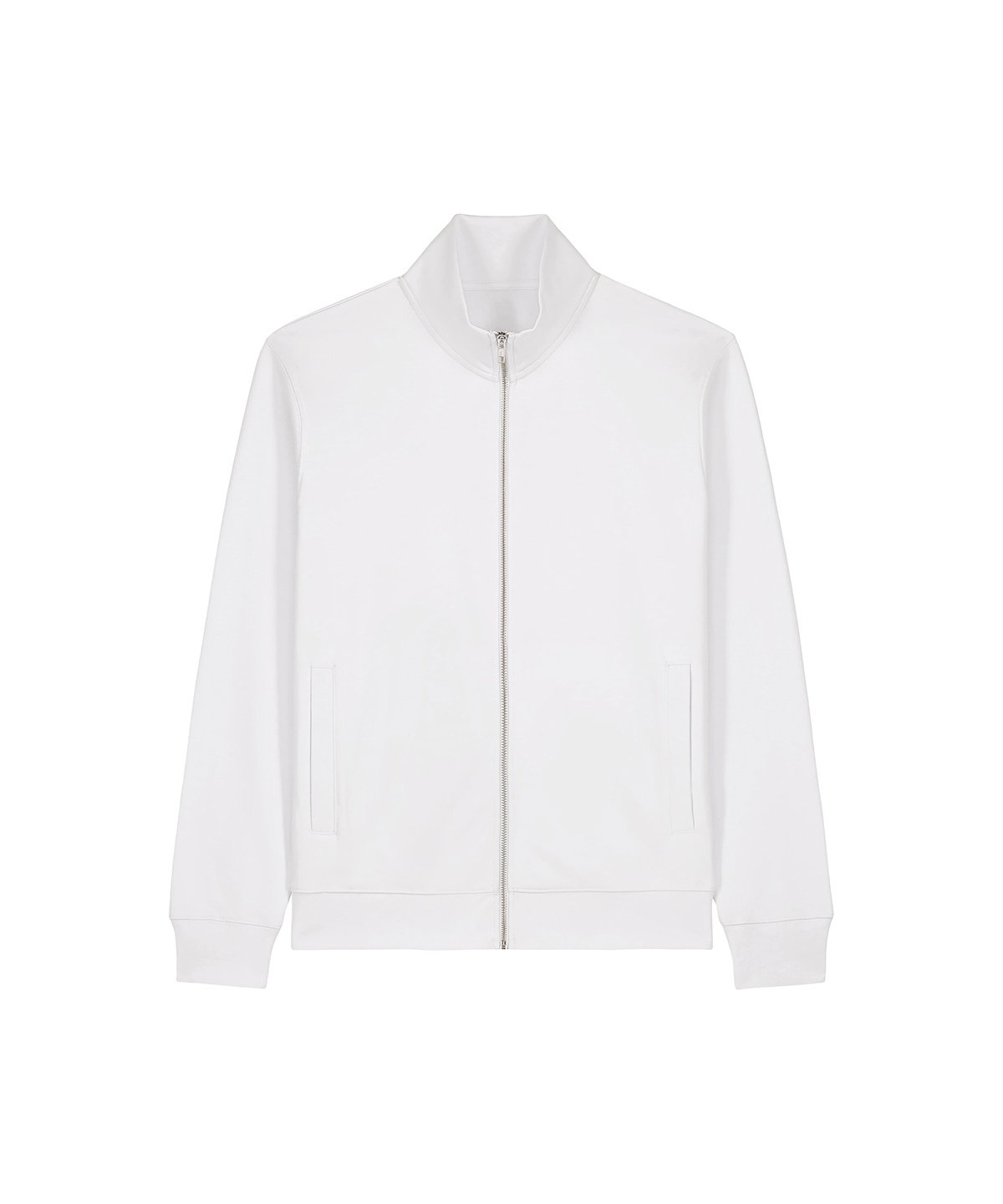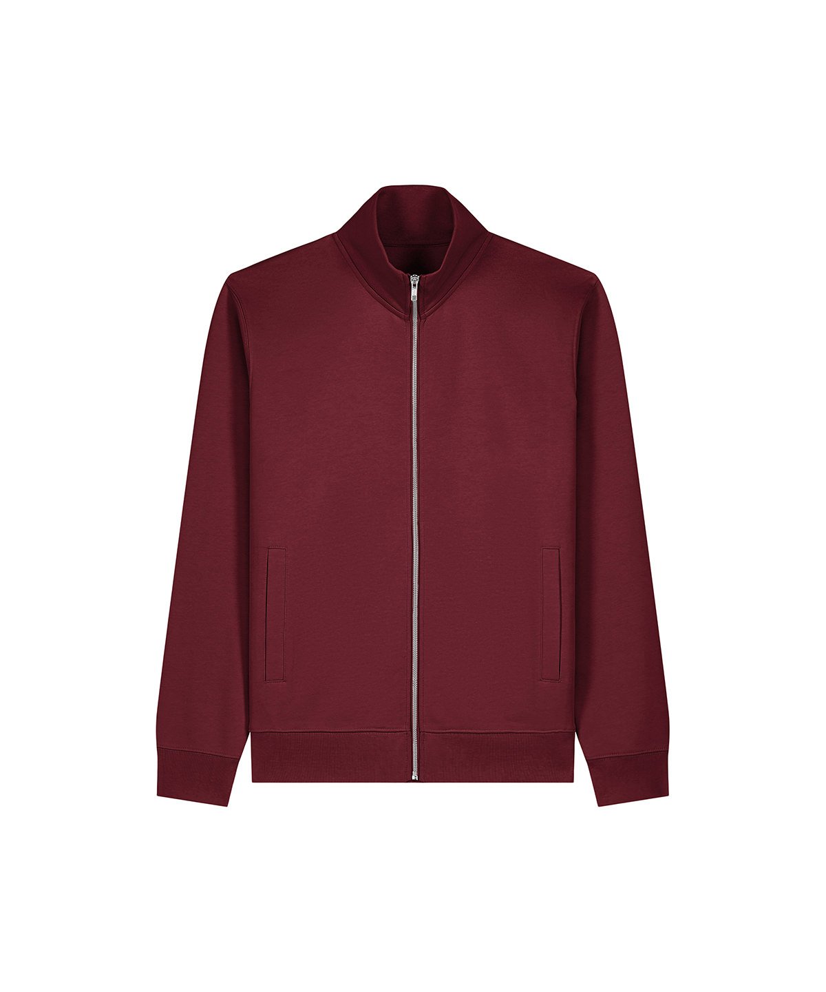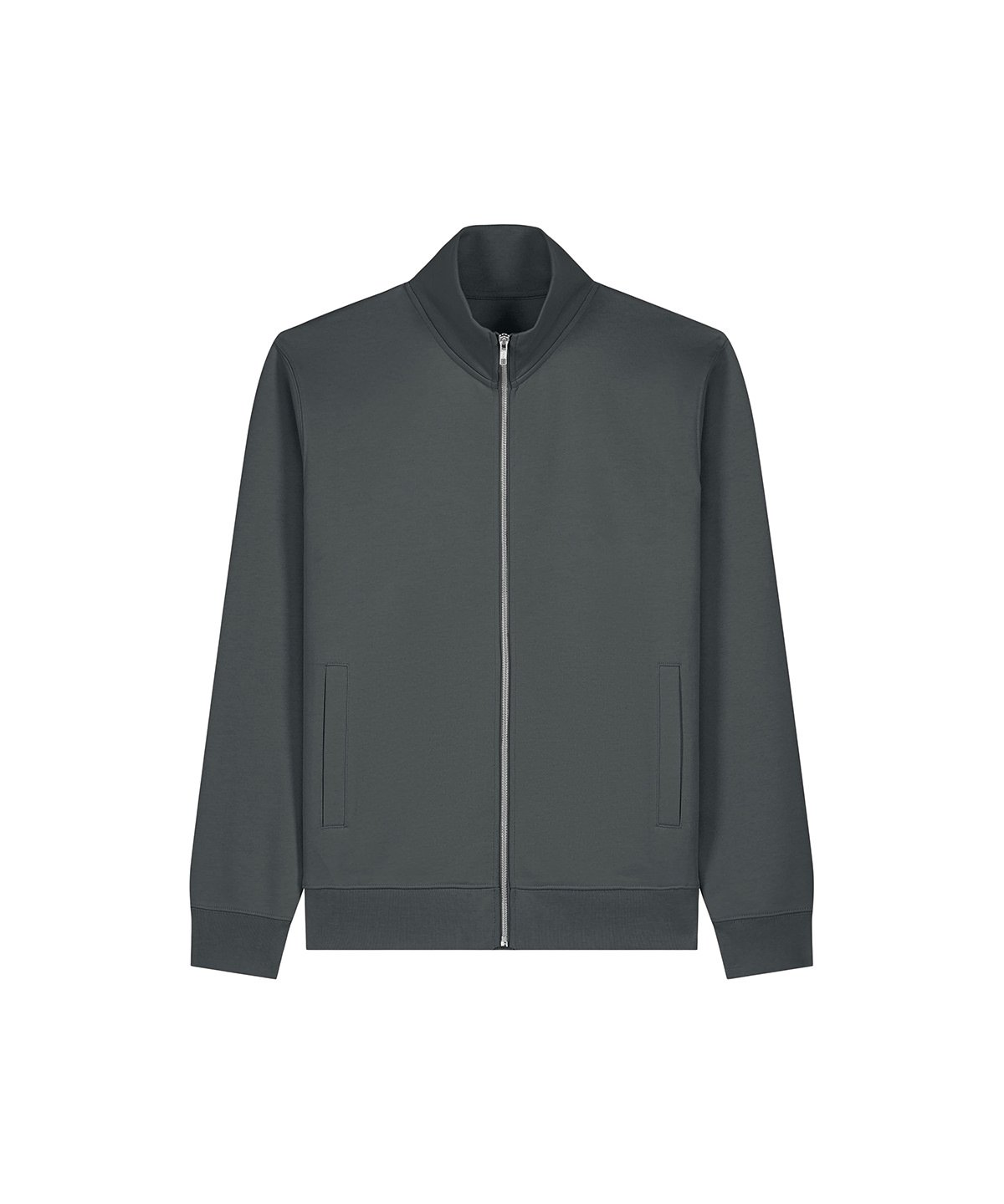 Unisex high-neck zip-through sweatshirt. Set-in sleeves. Self-fabric high-neck collar. Inside herringbone back neck tape. Self-fabric half-moon at the back neck. Metal zip at centre front. Welt pockets. 1×1 rib at sleeve cuffs and hem. Contains certified organic cotton and recycled polyester.