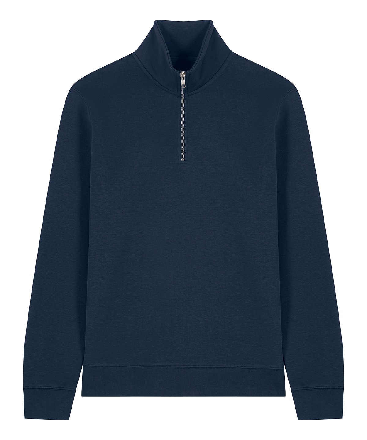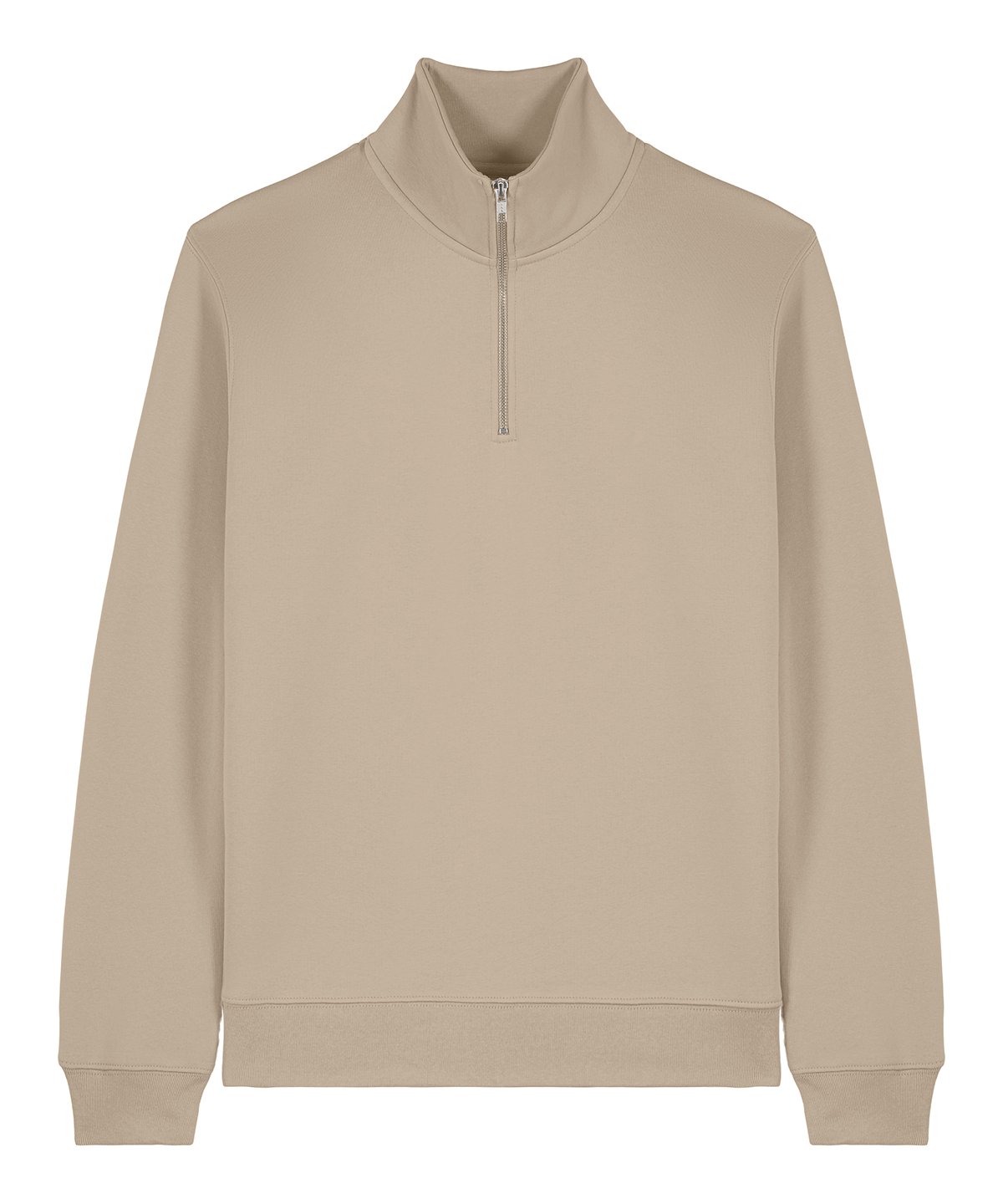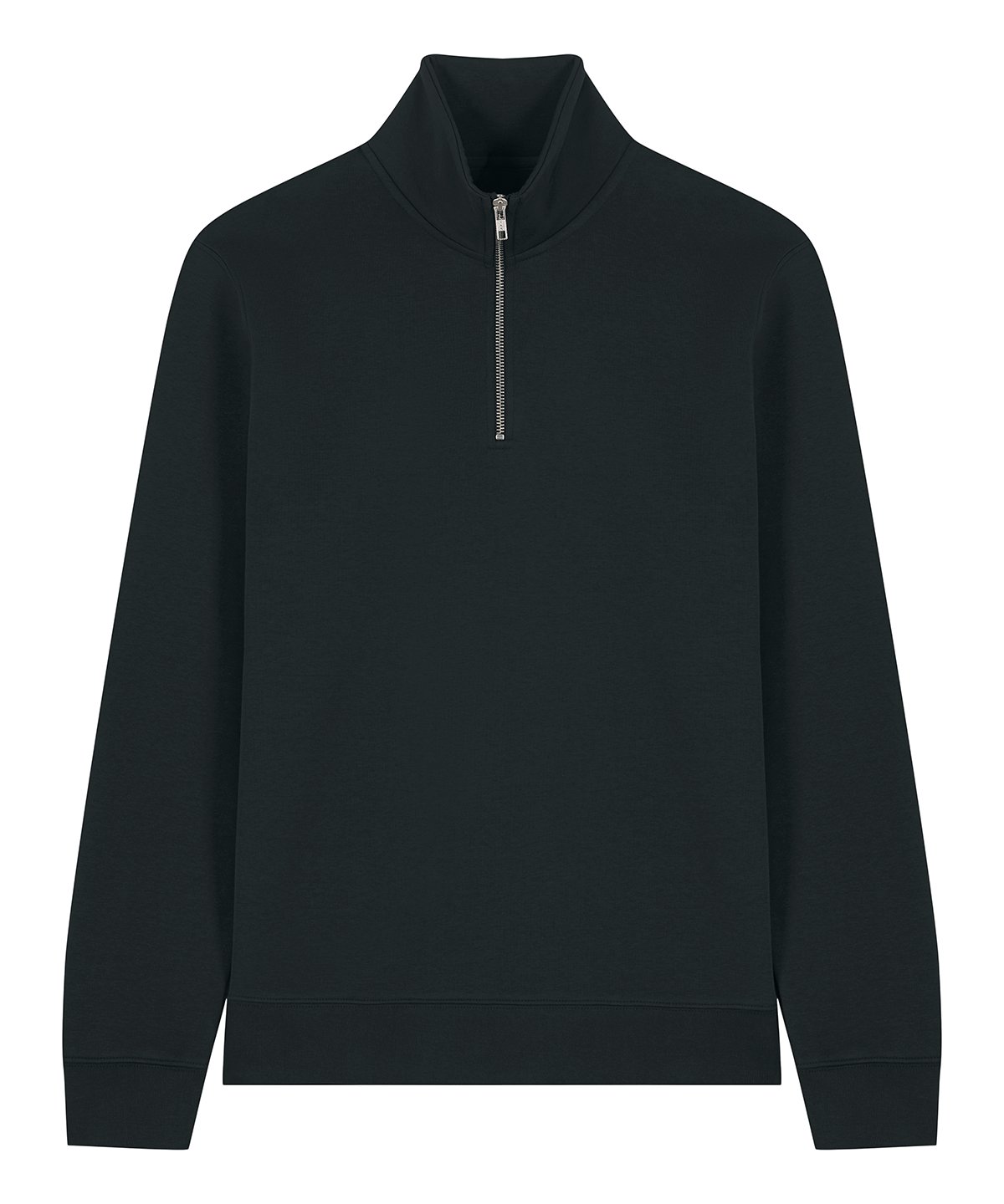 Set-in sleeves. Self-fabric mock neck collar. Quarter-zip at the centre front. 1×1 rib at sleeve cuffs and bottom hem. Double-needle topstitches at the armhole, sleeve cuffs and bottom hem. Herringbone tape at the inside back neck and the inside of the zip. Self-fabric half moon at back neck.