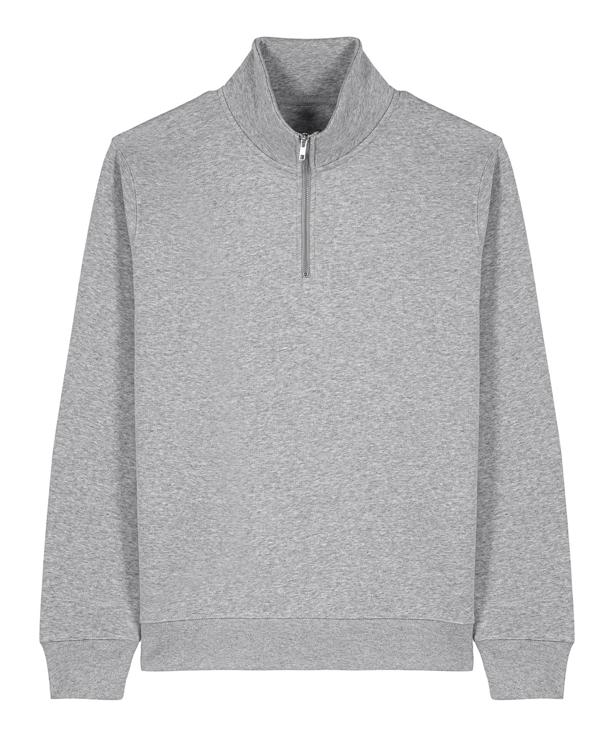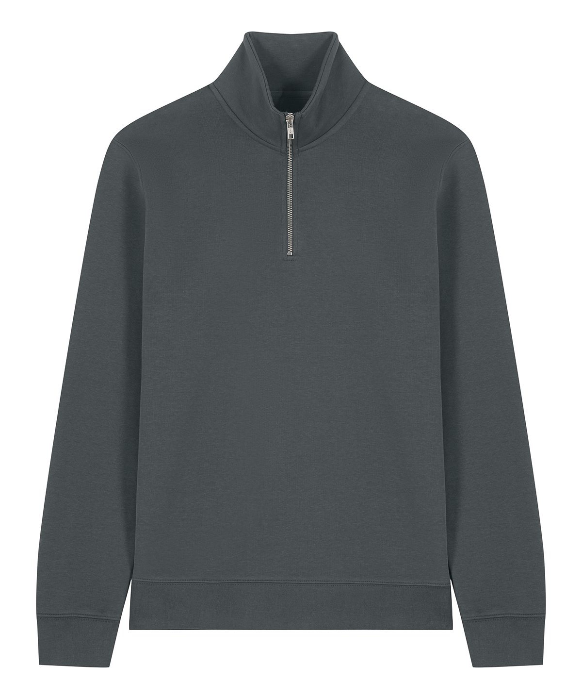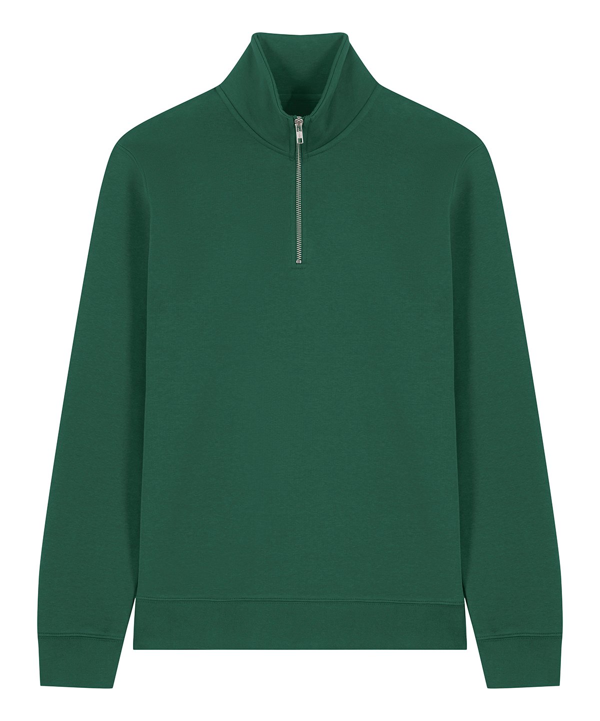 Set-in sleeves. Self-fabric mock neck collar. Quarter-zip at the centre front. 1×1 rib at sleeve cuffs and bottom hem. Double-needle topstitches at the armhole, sleeve cuffs and bottom hem. Herringbone tape at the inside back neck and the inside of the zip. Self-fabric half moon at back neck.