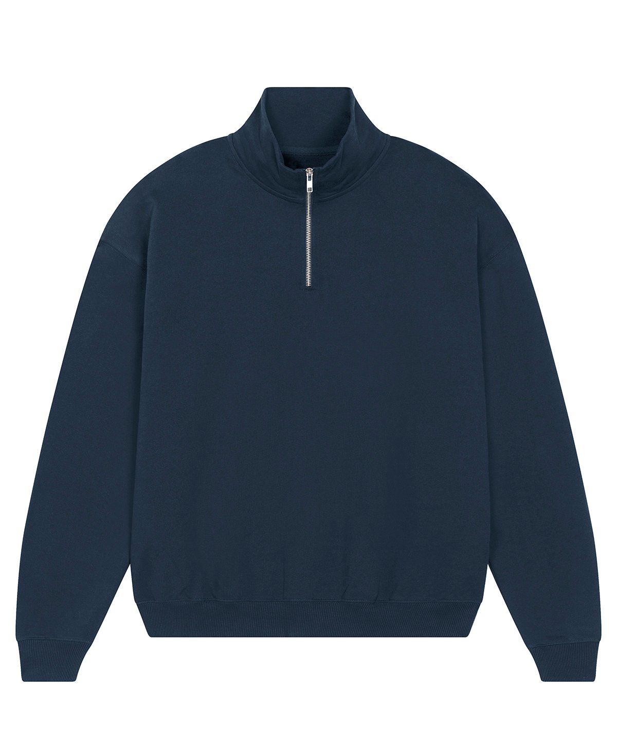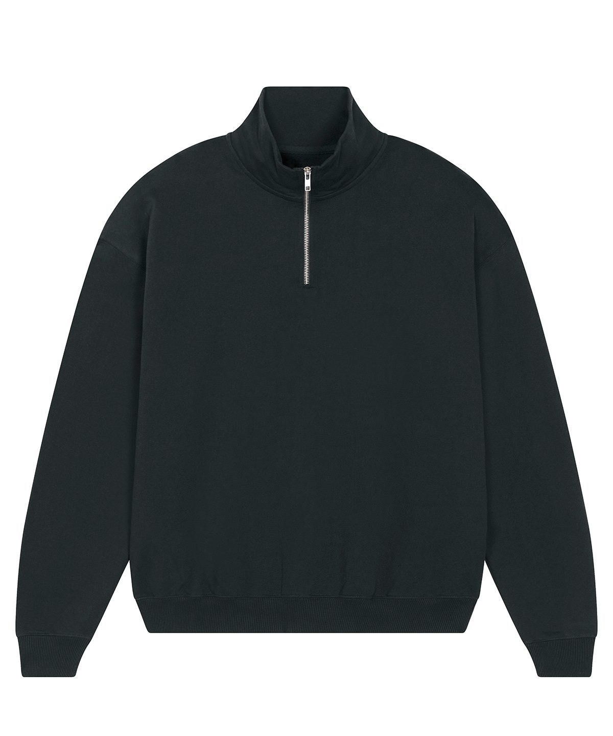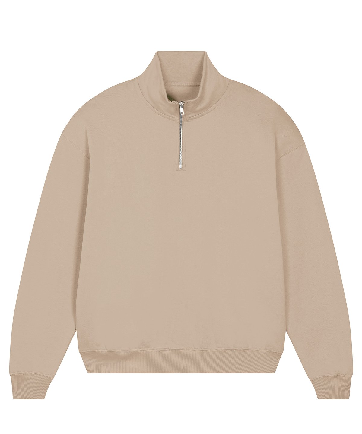 Unisex boxy dry hand feel quarter zip sweatshirt. Set-in sleeve. Neck collar in self-fabric. Herringbone tape at inside back neck and at inside of zip. Quarter zip at centre front. 2×1 rib at sleeve hem and bottom hem. Armhole, sleeve hem and bottom hem with twin-needle topstitch.