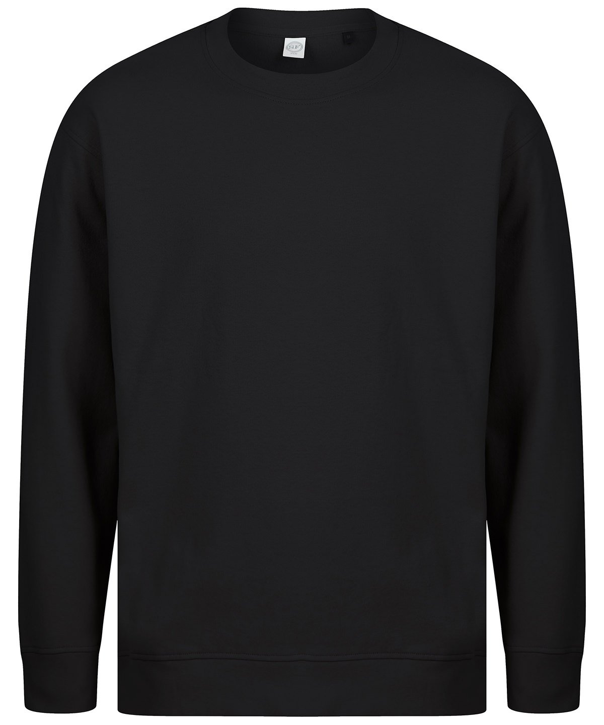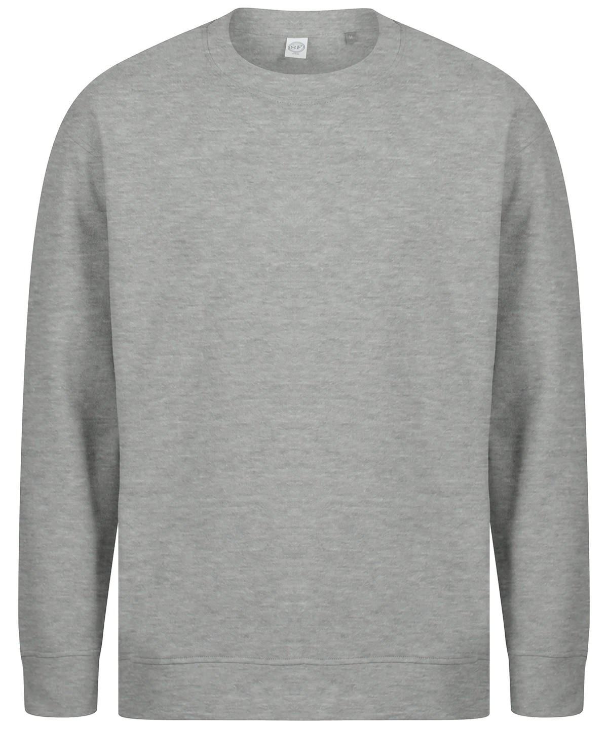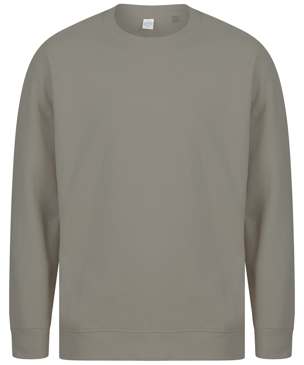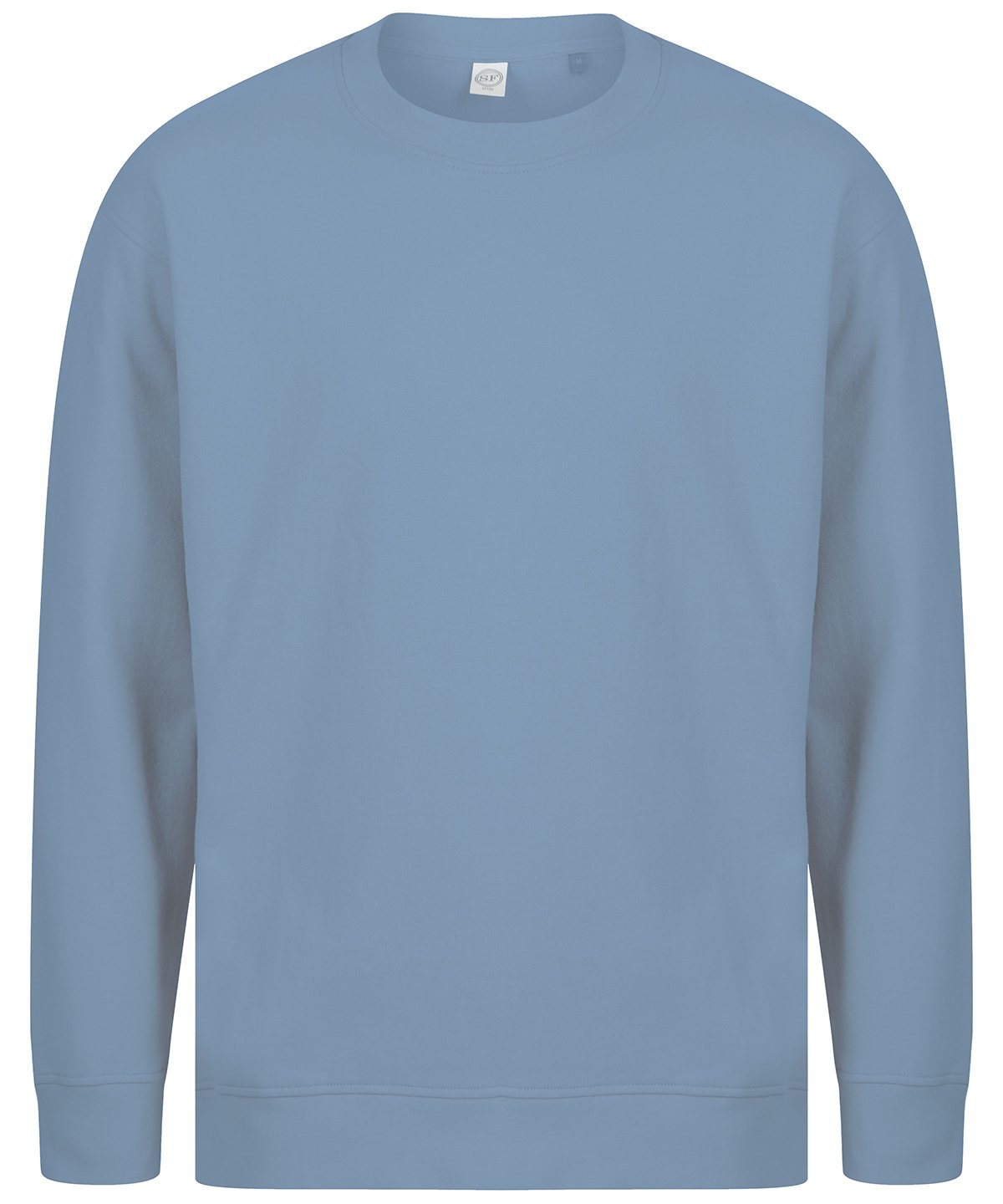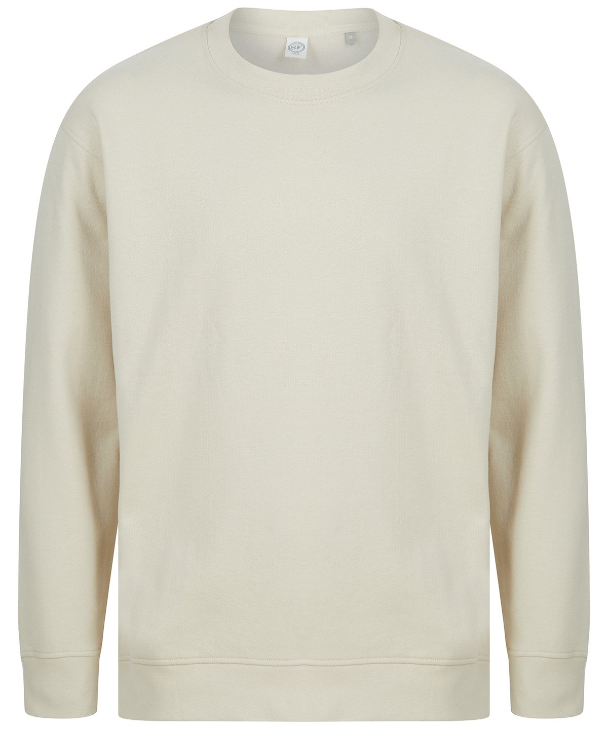 Unisex relaxed-fit sweat. Set-in sleeves, dropped shoulders. Droptail hem – curved high front, low back. Ribbed hem cuffs and crew neck. Single Jersey back neck tape and facing. Tonal topstitching detail. Brand-free, for easy rebranding. Contains recycled cotton and recycled polyester.